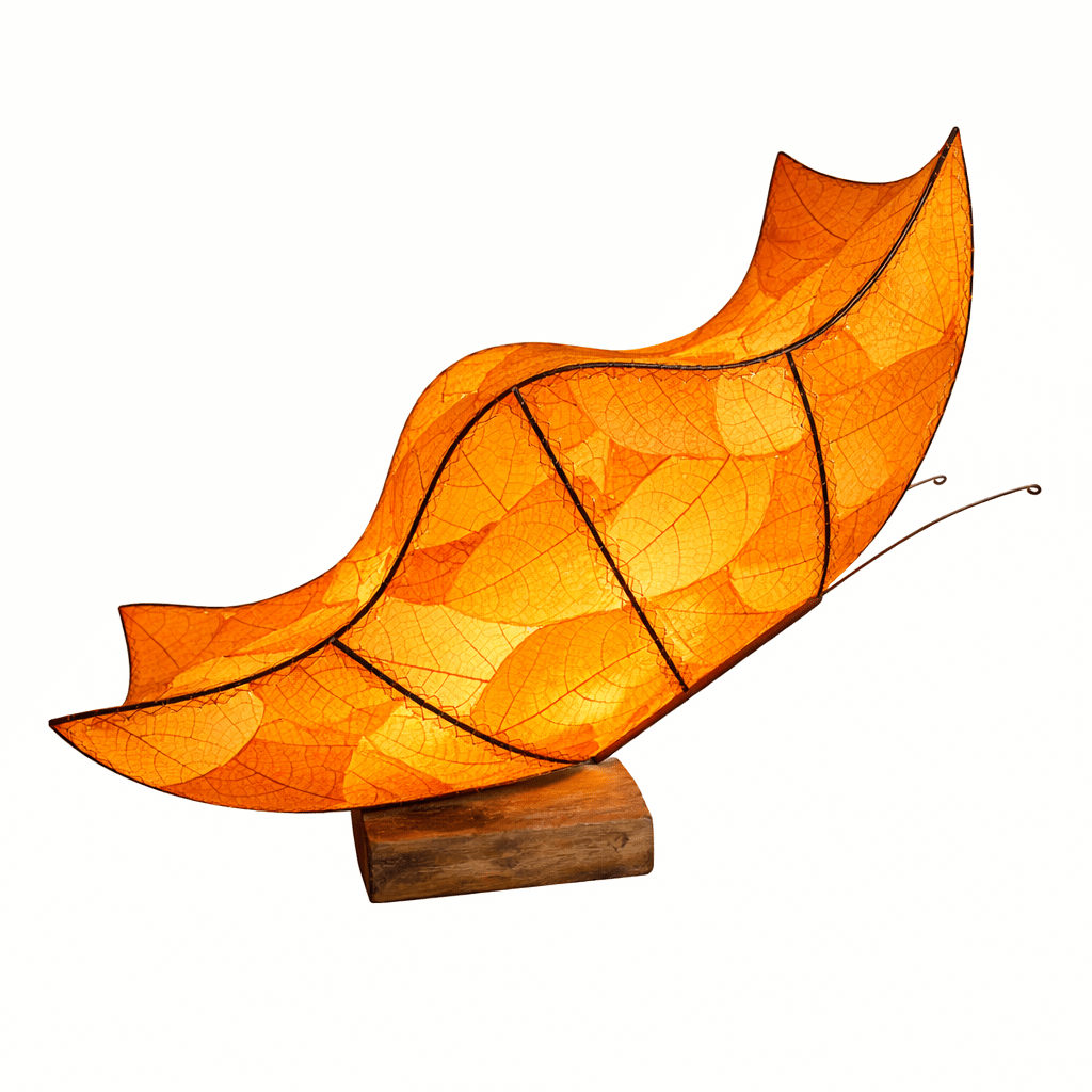 The Butterfly Large Table Lamp Series is designed to interrupt a space in the best possible way. Its sweeping form echoes open wings, crafted from real fossilized cocoa leaves adhered to UL-approved lamp backing so the natural veining becomes part of the light itself. The silhouette feels fluid and sculptural, softening straight lines and bringing movement to rooms that feel too rigid.