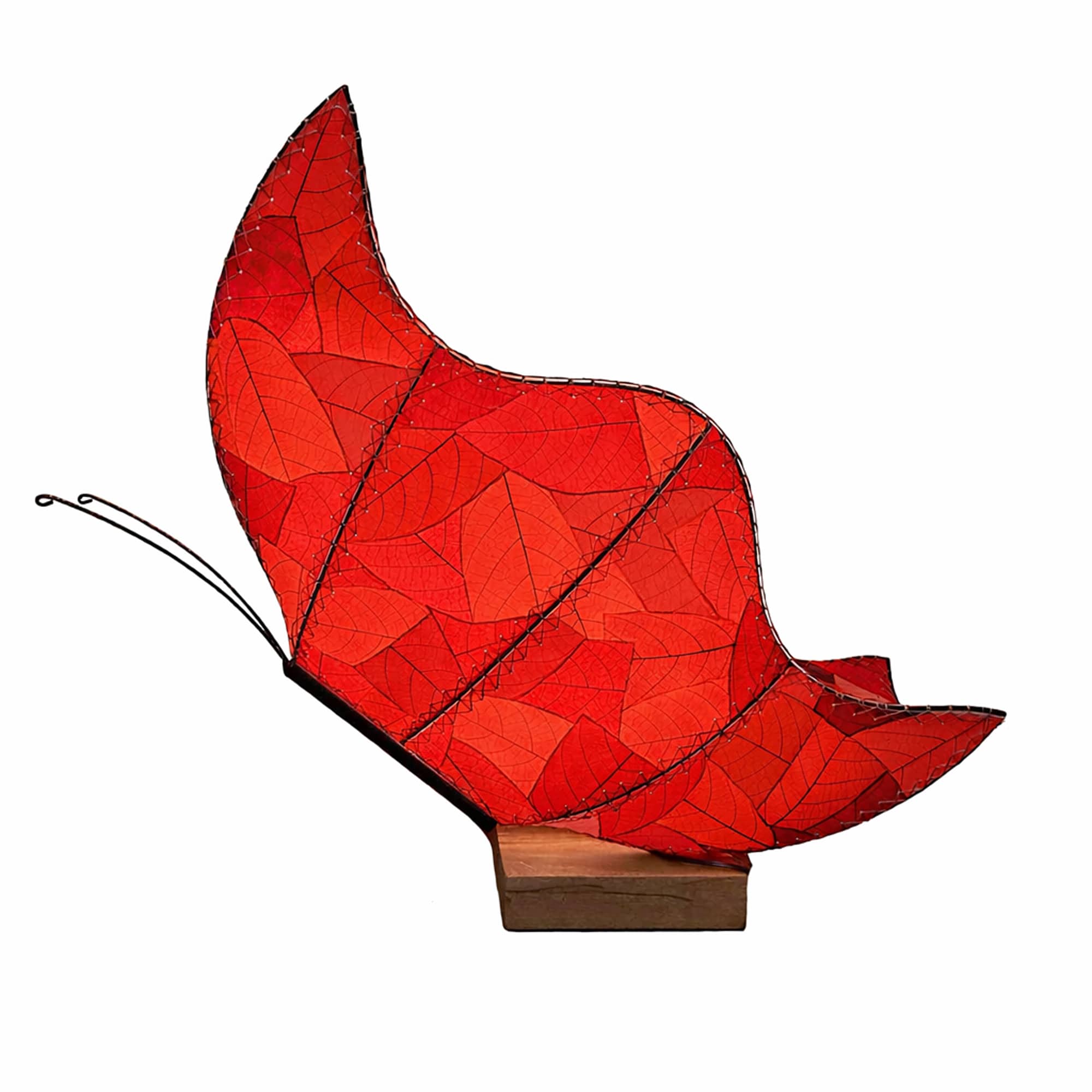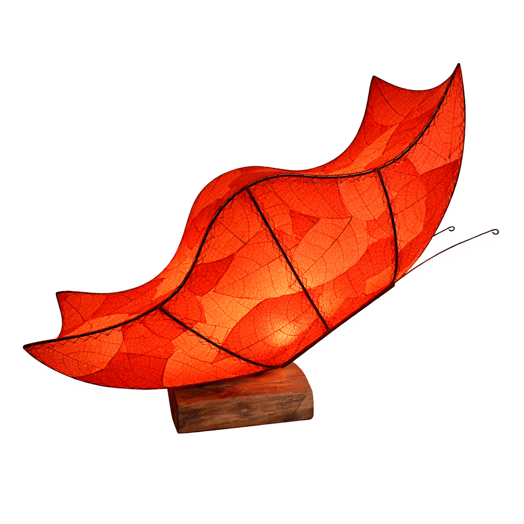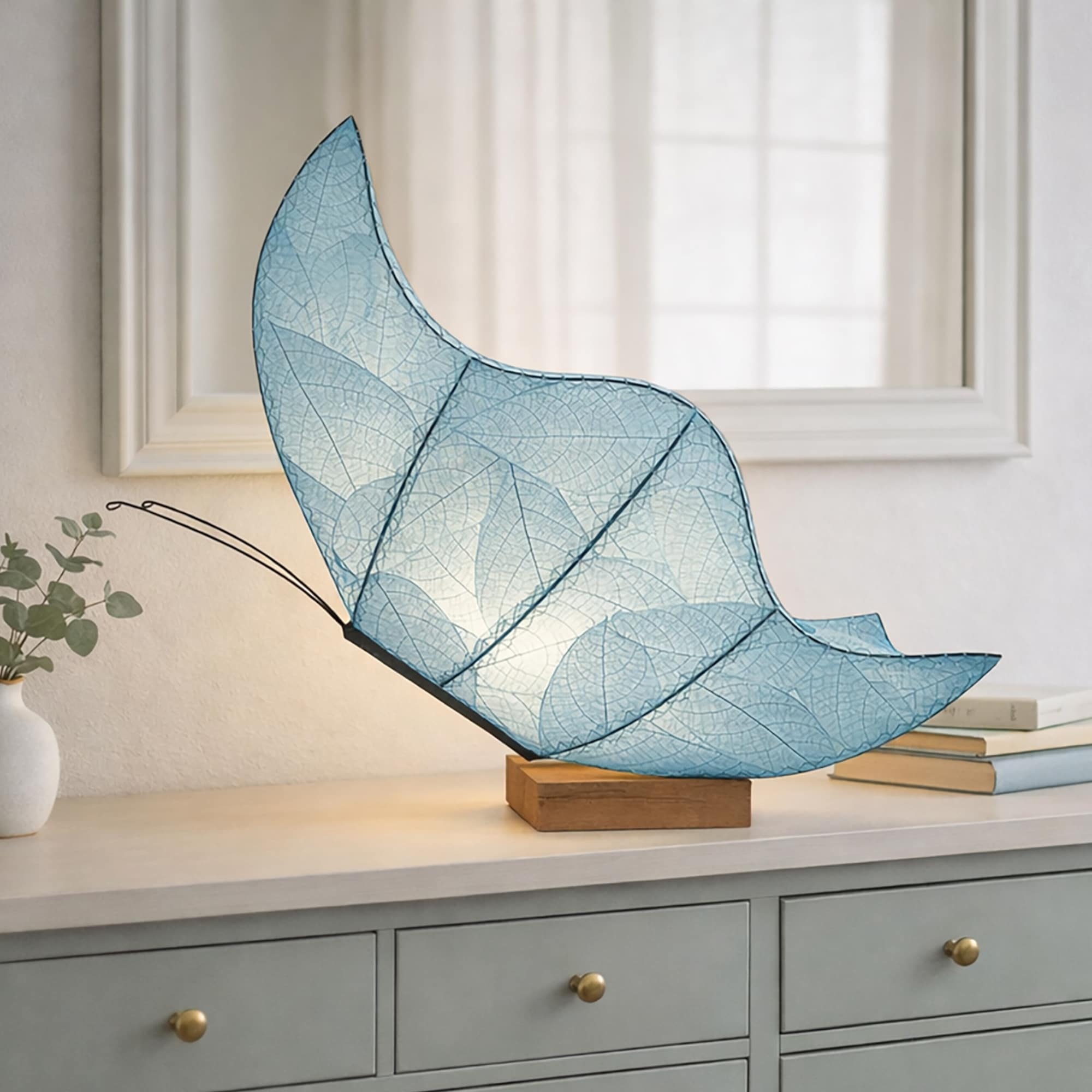 The Butterfly Large Table Lamp Series is designed to interrupt a space in the best possible way. Its sweeping form echoes open wings, crafted from real fossilized cocoa leaves adhered to UL-approved lamp backing so the natural veining becomes part of the light itself. The silhouette feels fluid and sculptural, softening straight lines and bringing movement to rooms that feel too rigid.