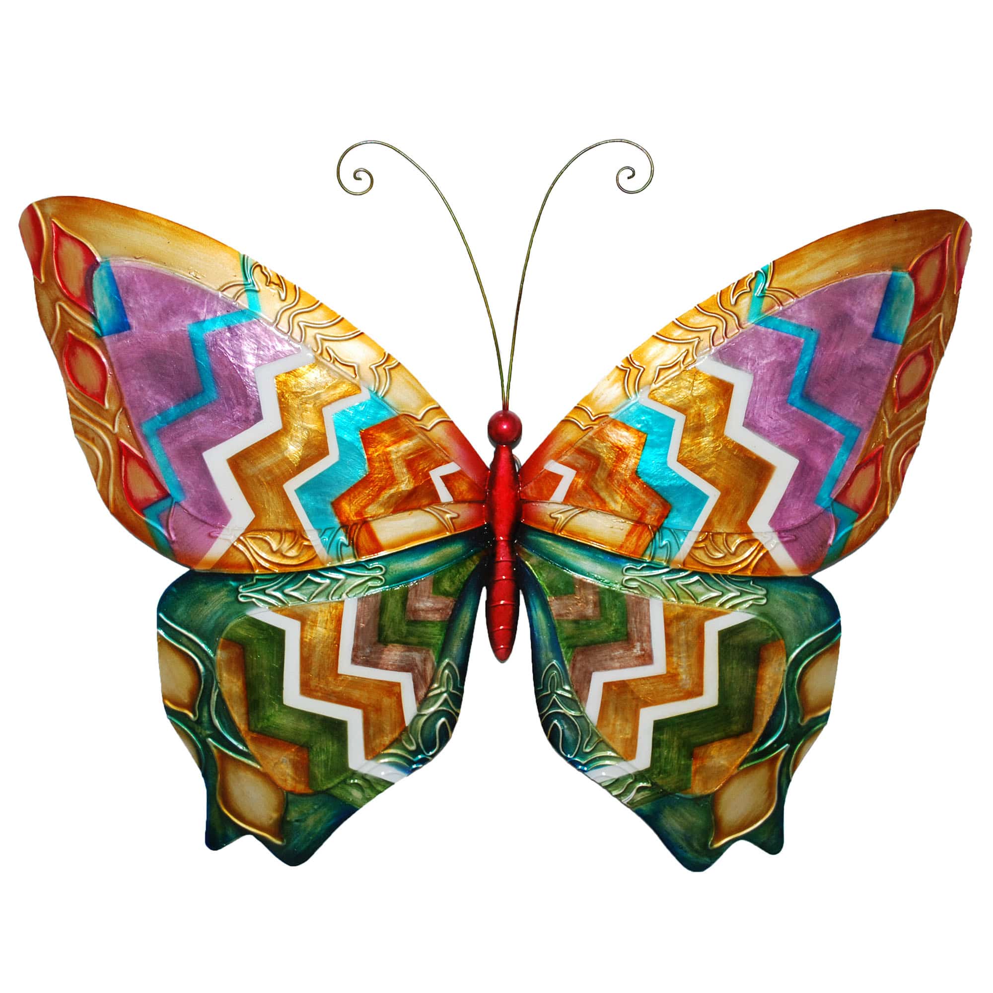 This butterfly shows sharp, bold, beautiful contrasting colors. Using a stylized design, the artist uses shimmering capiz shell and radiating zig zag patterns to create warmth and excitement. These bright colors are complimented by a subtle texture set within the metal work.