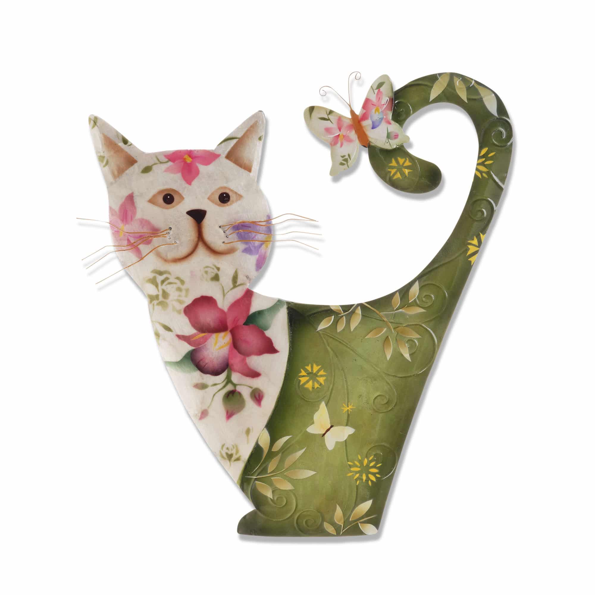 From the smile on its face to the butterfly resting on its tail, this happy cat brings warmth and joy. This kitty’s face and chest is adorned with mother of pearl capiz shell. The artist then hand-painted flowers on top of the shell. The floral theme continues on the lower half of the body, both in being painted on and being pressed into the tin. The contrasting pearl and green ensures this piece fits in nearly any decor style.