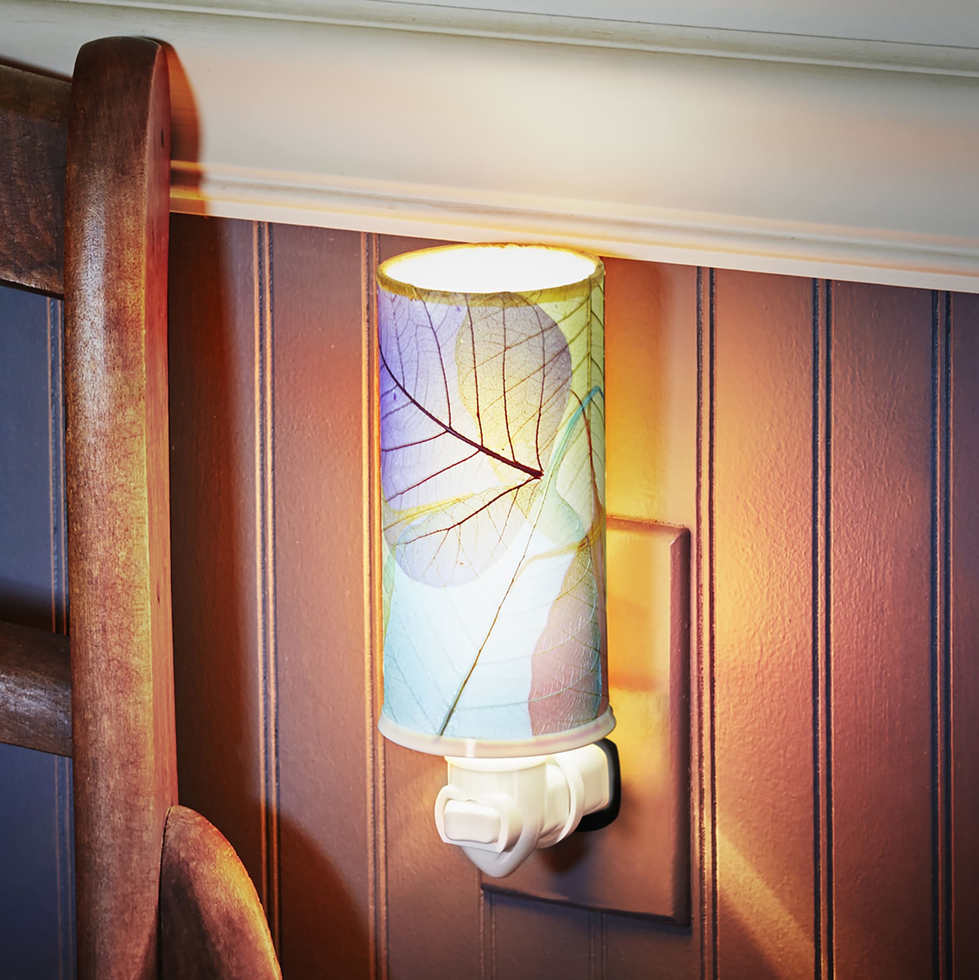Crafted with fossilized banyan leaves and hand-applied in delicate layers, the shade glows with subtle detail. The rotating base adapts to your outlet orientation, while the on/off switch adds ease. Every part is made with intention—from the eco-friendly materials to the fair-trade hands that shape it. This is light not just for function, but for feeling.