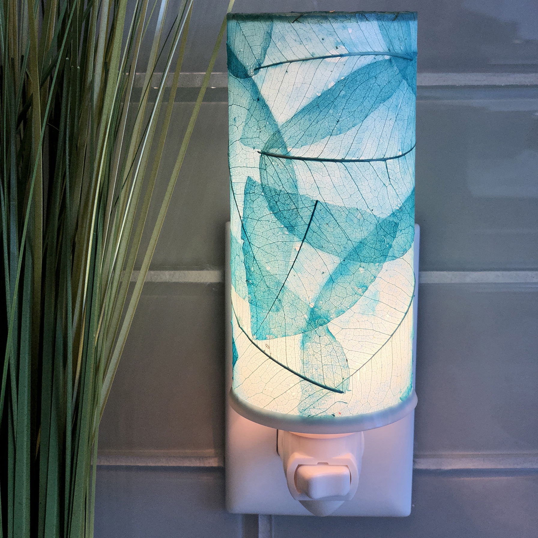 Crafted with fossilized banyan leaves and hand-applied in delicate layers, the shade glows with subtle detail. The rotating base adapts to your outlet orientation, while the on/off switch adds ease. Every part is made with intention—from the eco-friendly materials to the fair-trade hands that shape it. This is light not just for function, but for feeling.