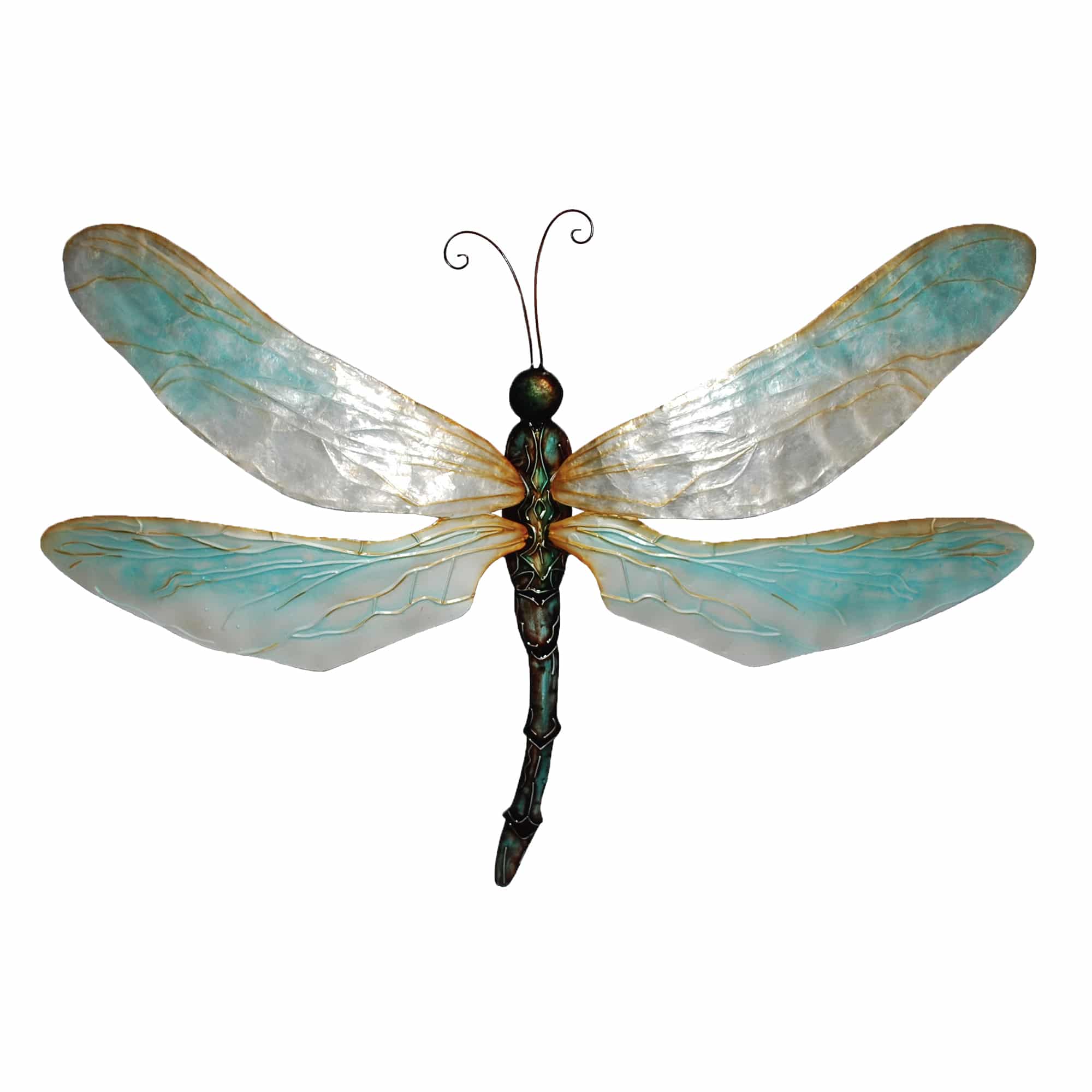 The basic frame of the dragonfly is created using tin, which is powder-coated with a black finish and makes this piece safe to use outdoors. The edges of the frame are reinforced using thicker tin wire. The front of this piece is adorned in areas with capiz shell, an oyster native to the Philippines, before being hand-painted and sealed with a water-based sealant. The primary purpose of this oyster to provide a source of food, however, the shell is a sustainable by-product that can be used for decoration. The capiz shell subtly replicates the reflective qualities of dragonflies in nature. The entire piece is lightweight and has an eyelet in the back allowing it to be hung using a finishing nail, command strip, or a push pin.
