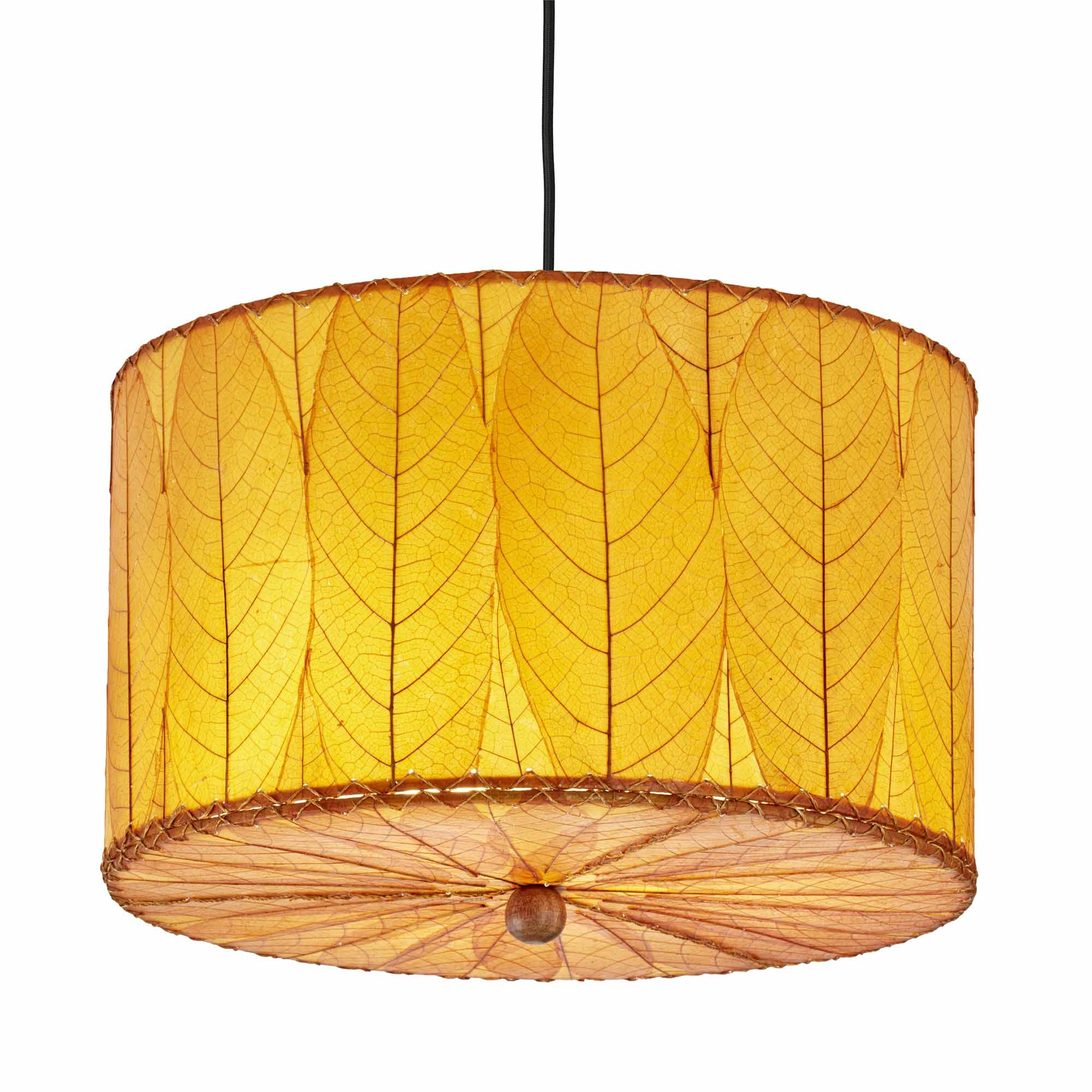 The 18-Inch Drum Pendant blends natural texture with mid-century simplicity—elevating your space with warmth, symmetry, and an unexpected touch of nature. Its classic shape anchors the room, while the hand-laid cocoa leaves glow from within, bringing softness to clean lines and depth to open air.