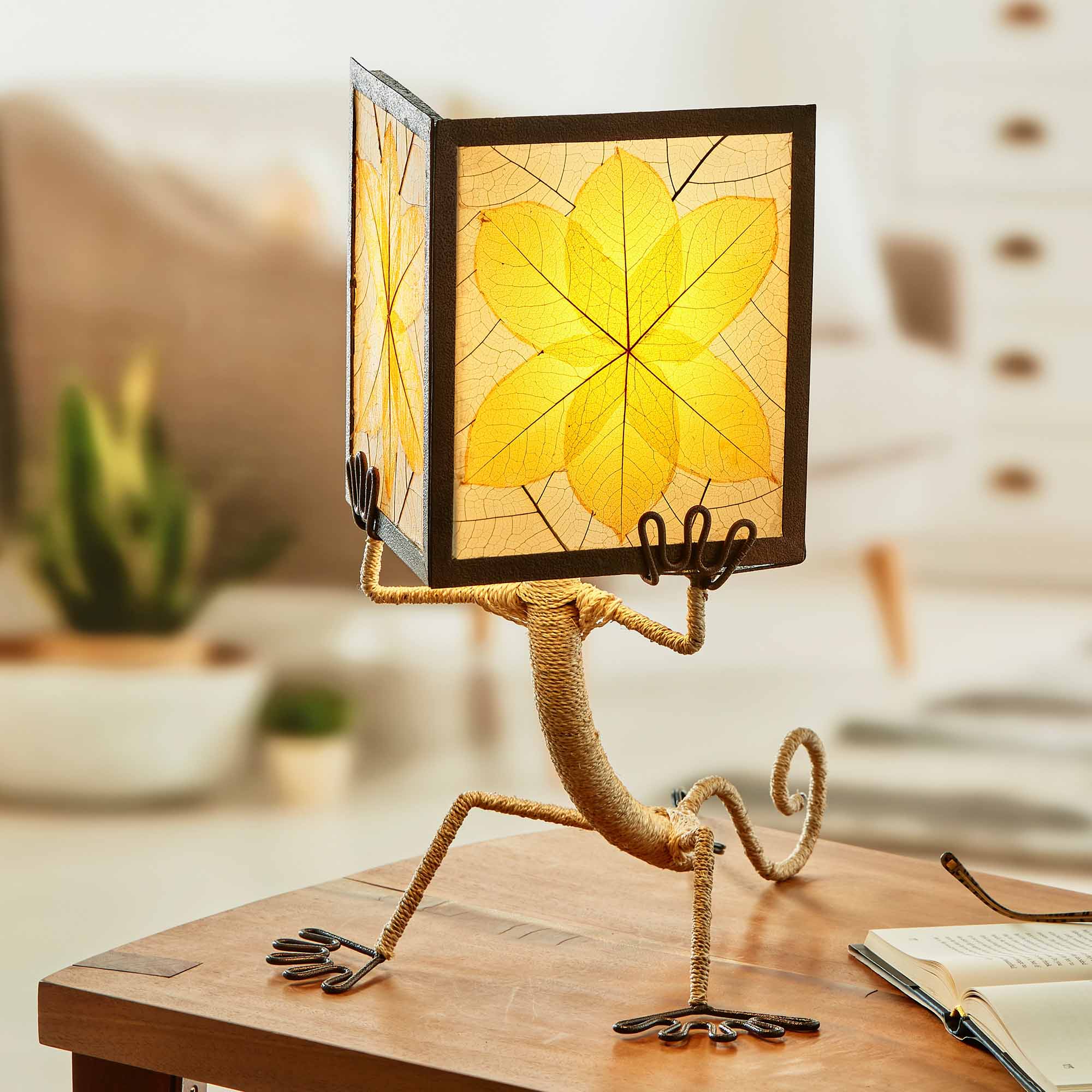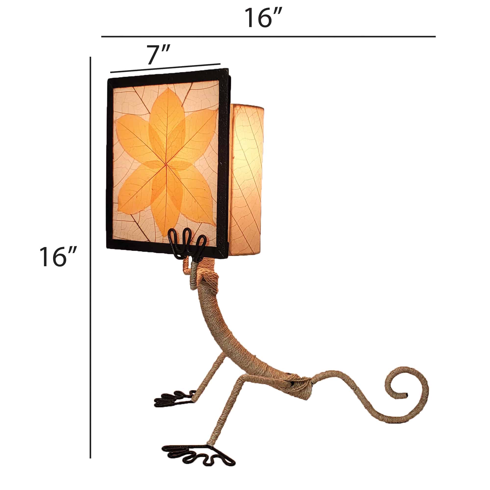 The Enlightened Gecko Table Lamp is pure personality—clever, curious, and completely charming. Caught mid-study, this lamp captures the playful energy of a lizard with its nose in a book. Its frame—crafted from wrought iron and wrapped in natural abaca—gives the gecko lifelike movement, while the lamp shade doubles as its reading material, glowing softly with fossilized leaves.