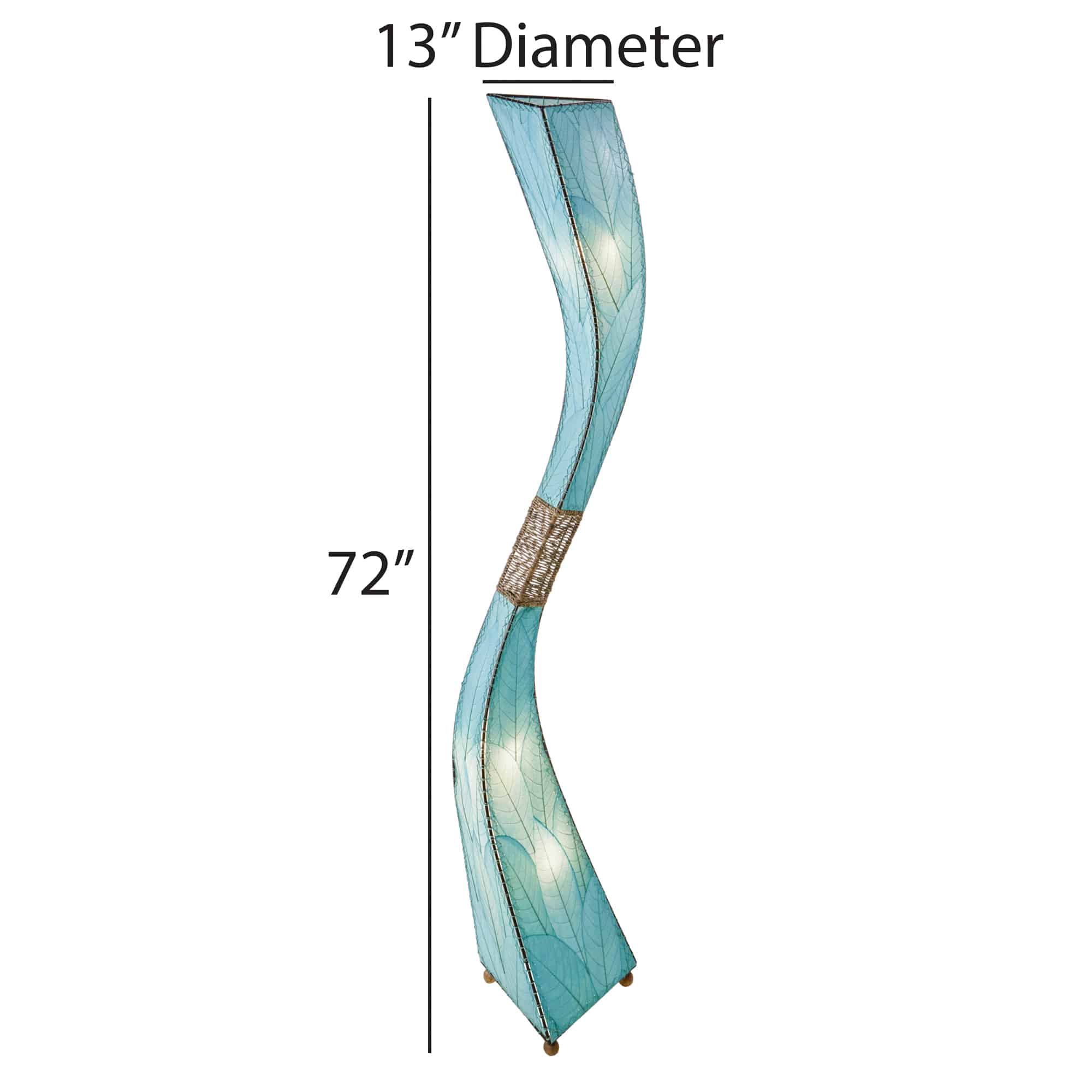 Crafted by hand, each side is composed of real cocoa leaves, pressed and preserved to reveal their delicate veins. As light passes through, the patterns shimmer softly, like sunlight on water. At the center, a band of woven abaca rope creates a sense of rhythm and grounding—a natural pause in the lamp’s upward sweep.