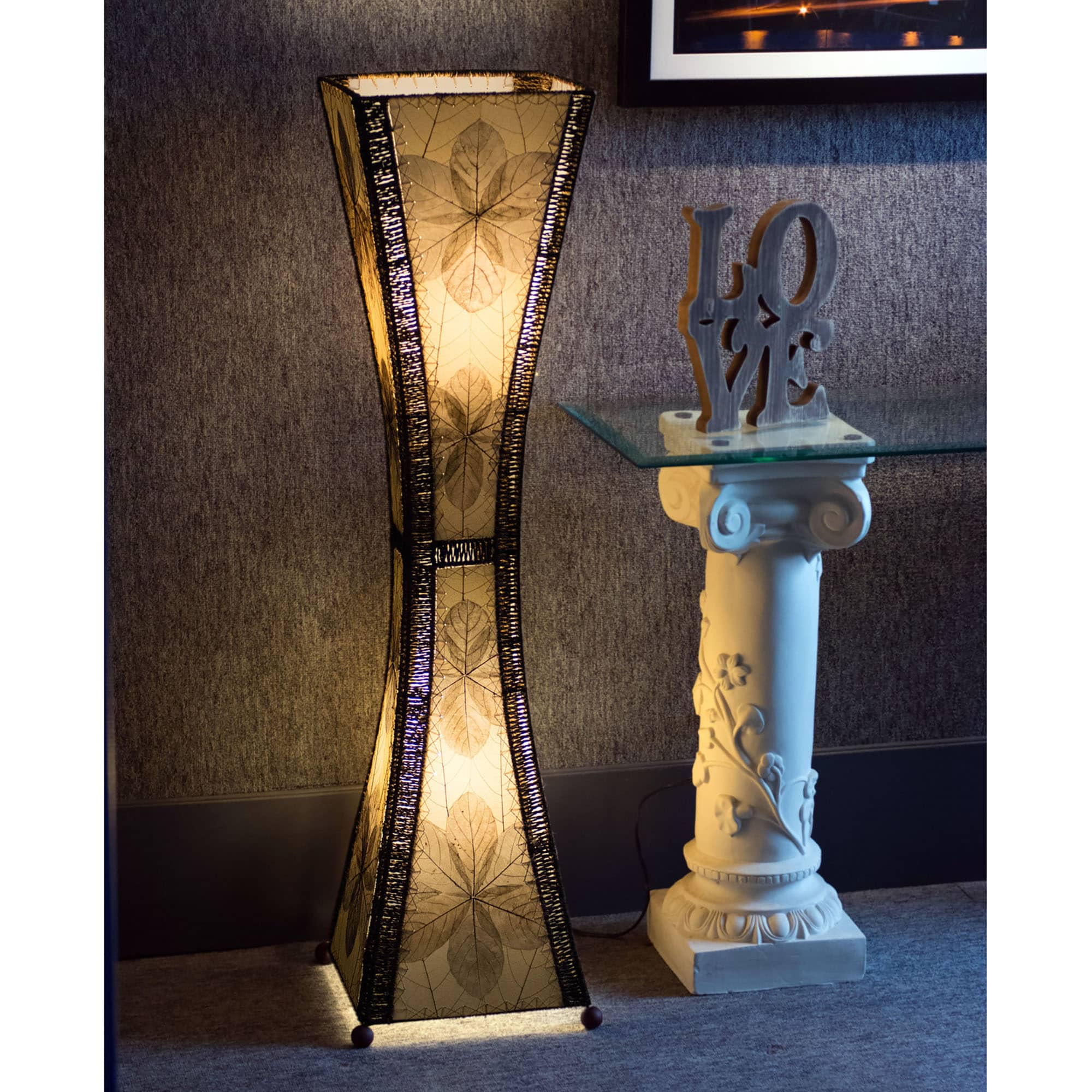 The Hourglass Large Floor Lamp is a quiet invitation to slow down. Its curved silhouette feels like a gentle breath—narrowing, expanding, holding space. The form is timeless, but the texture is alive with detail. Guyabano leaves, broad and full of story, are layered by hand into a soft bloom pattern that shifts with the light.