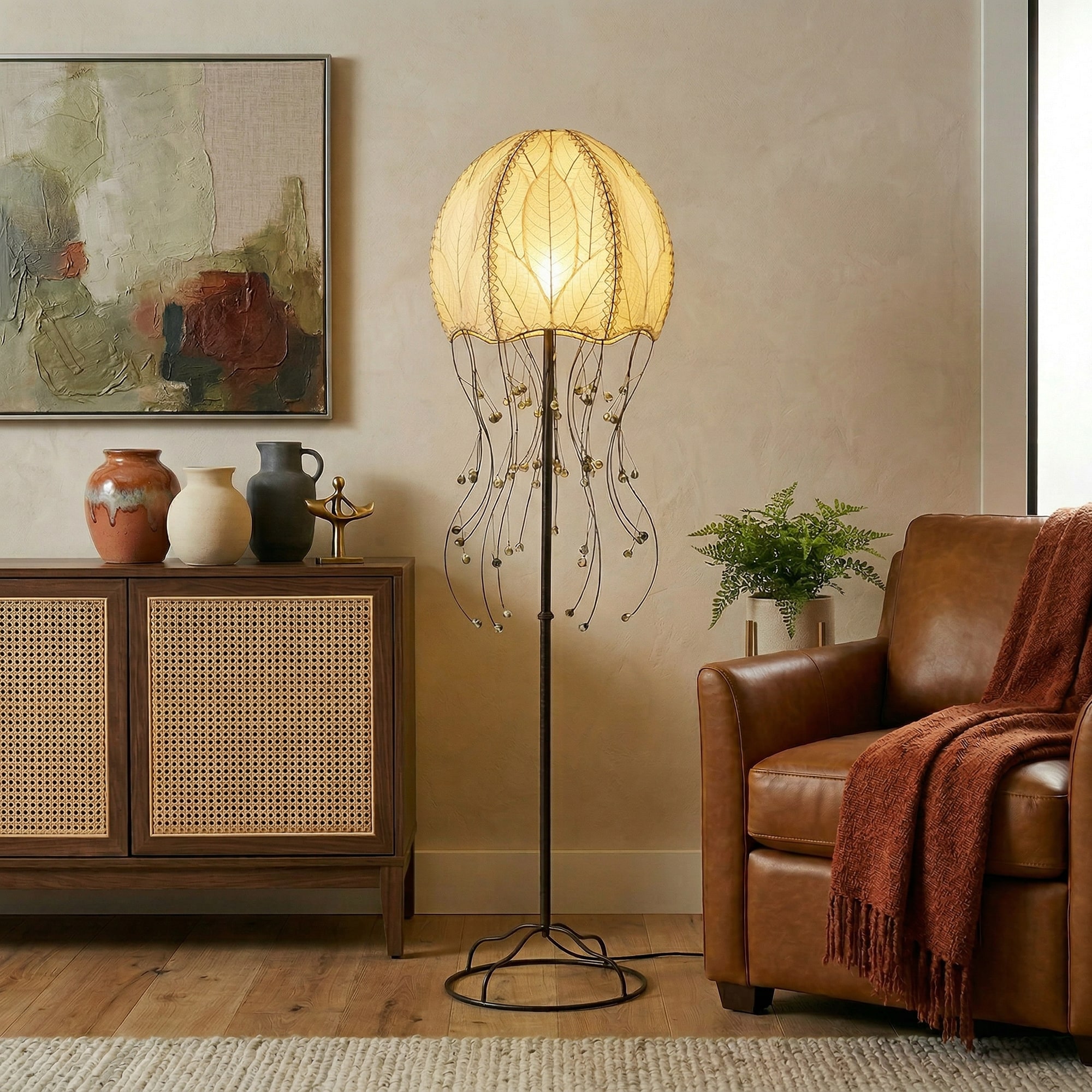 The dome-shaped shade is formed from real fossilized cocoa leaves, chosen for their delicate texture and hand-placed to create a softly glowing shell. Each lamp is stitched by hand and mounted onto a slender, powder-coated iron frame. From beneath, cascading wrought iron tendrils flow downward, each tipped with a single glass bead—reminiscent of a jellyfish’s drifting tentacles.