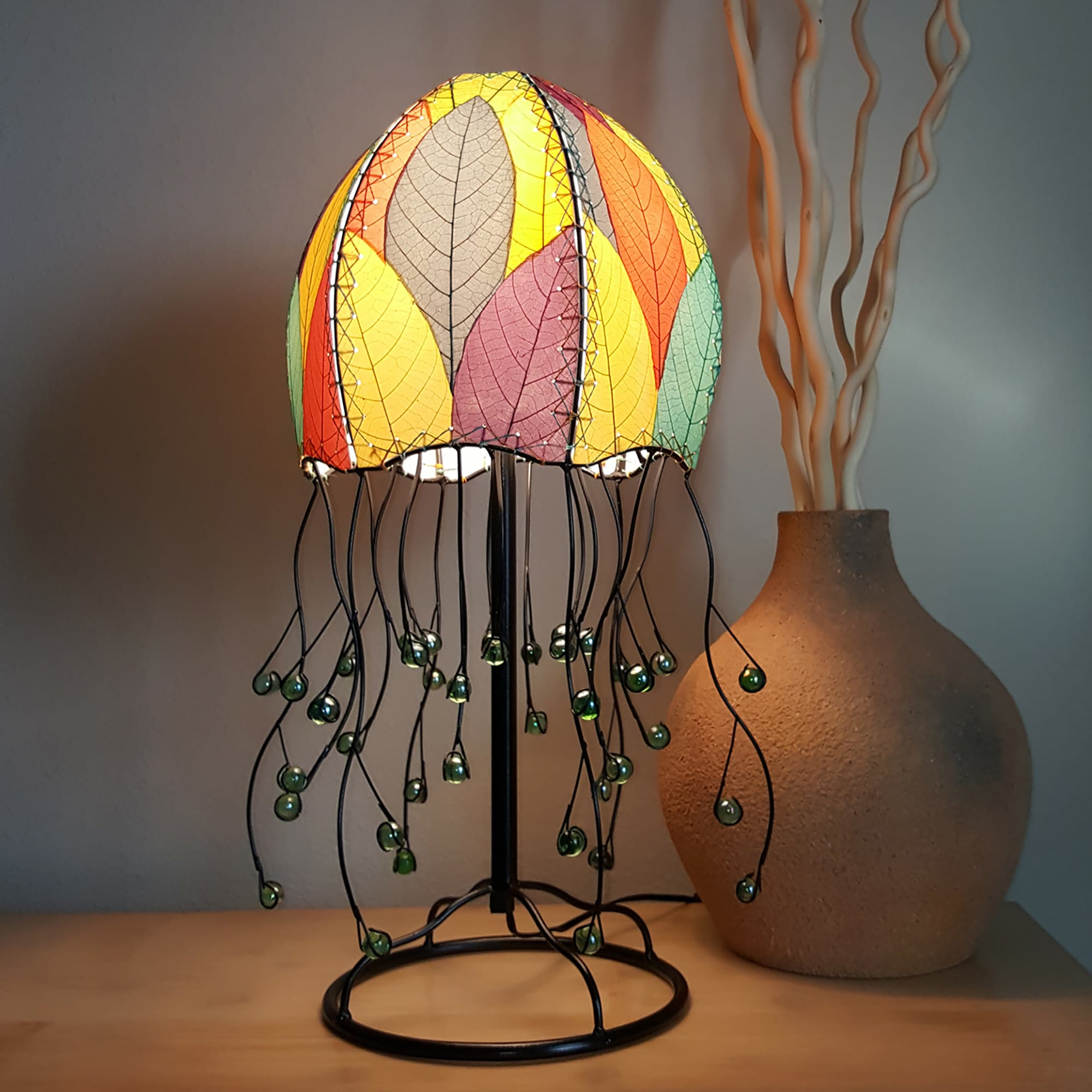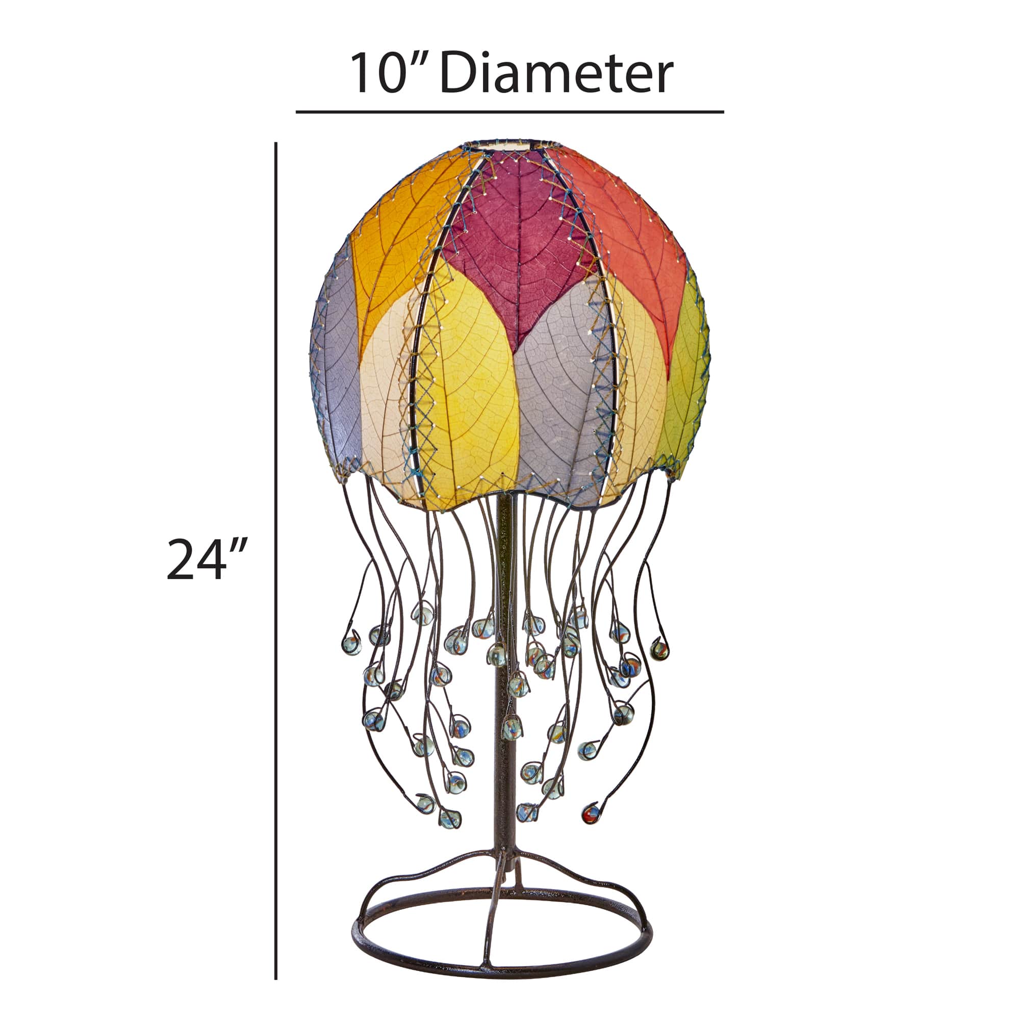 Some lamps spark curiosity. The Jellyfish Table Lamp invites wonder. Inspired by the drifting grace of ocean creatures, this sculptural piece blends natural beauty with playful imagination. The dome-shaped shade mimics a jellyfish’s body, while cascading wrought iron tendrils end in hand-blown glass beads—like bioluminescent stingers frozen mid-drift.