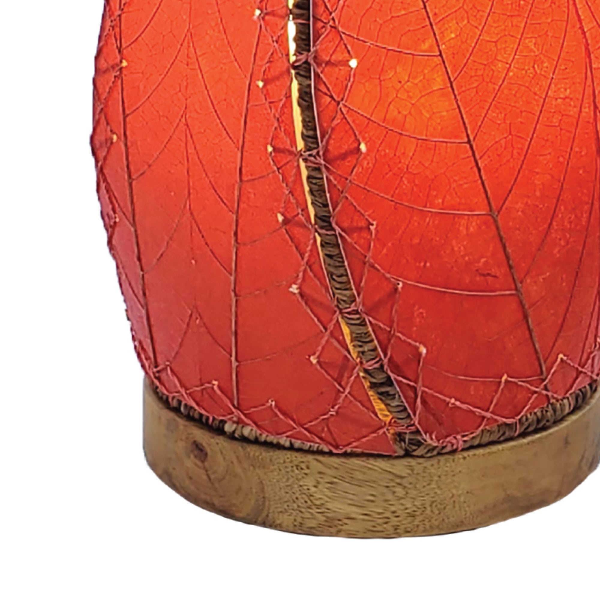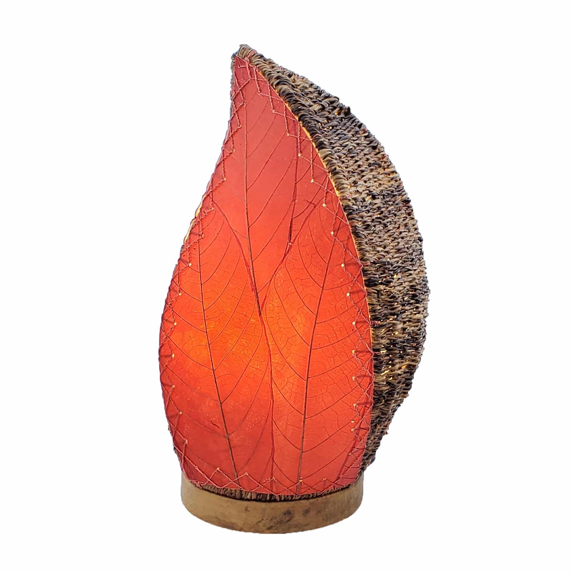 Each lamp is crafted by hand, starting with real fossilized cocoa leaves selected for their graceful structure and delicate vein patterns. Two panels are formed from these preserved leaves and stitched onto a wrought iron frame using abaca twine, while the third side offers a stunning contrast: a handwoven mesh made from renewable abaca fiber. It’s all anchored by a base of reclaimed mango wood—earthy, solid, and sustainably sourced.