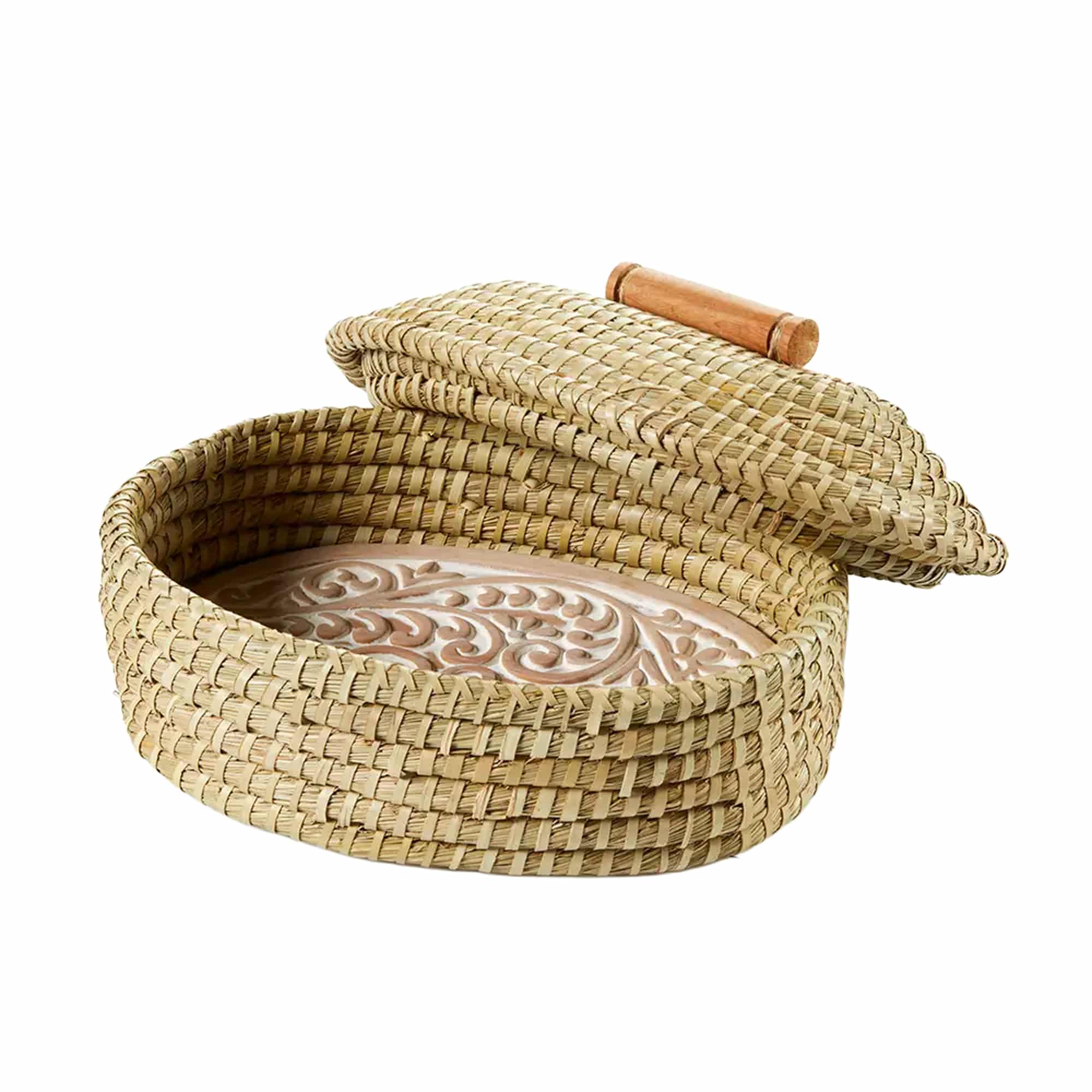 Crafted with care, the bread basket is made from sustainable kaisa grass and wrapped with palm leaf, showcasing the exquisite craftsmanship of our artisan partners. The mahogany wood handle attached to the lid with natural jute string adds a rustic and functional touch, making it a charming addition to any table setting.