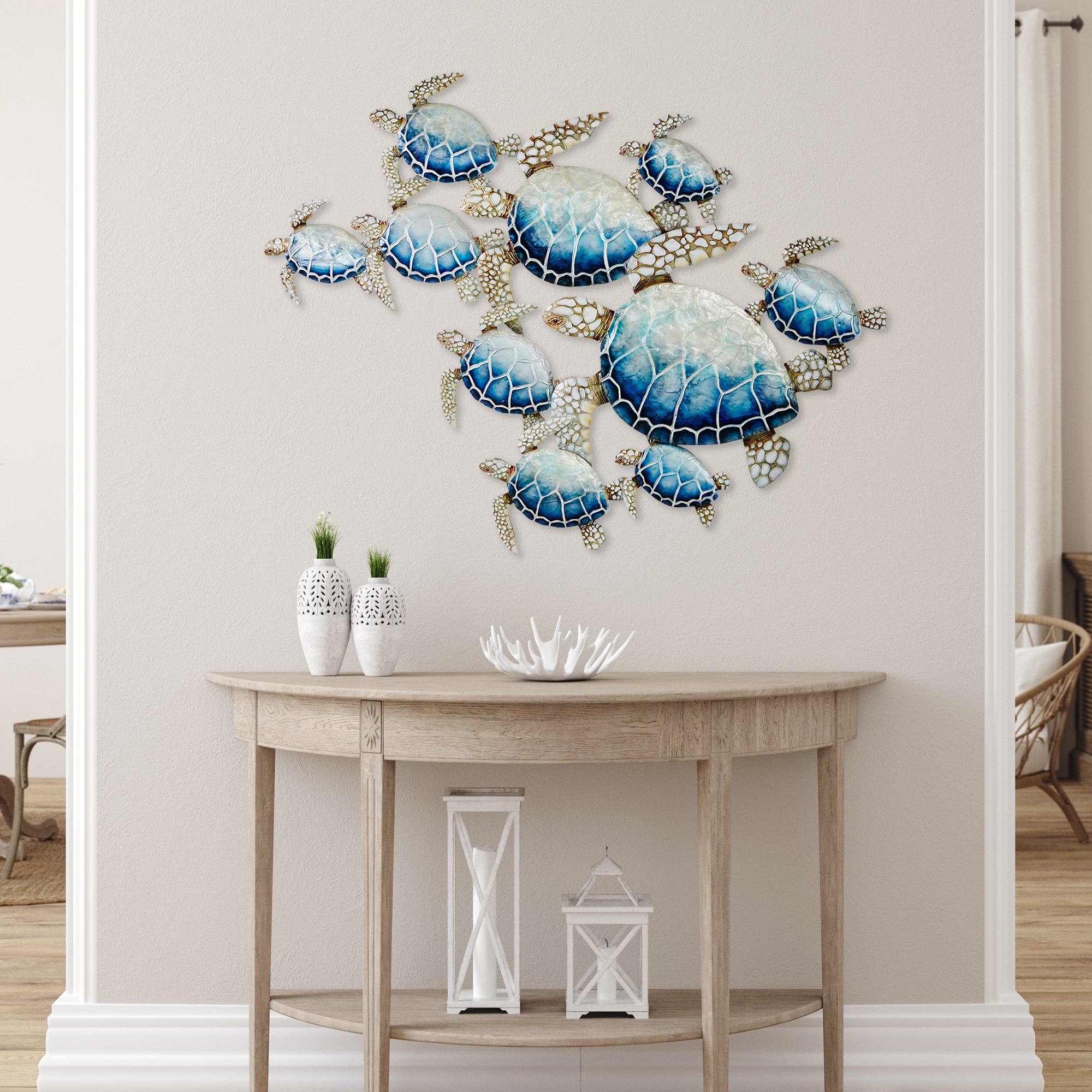 The basic frame of the turtle is created using tin, which is powder coated with a black finish. The frame is reinforced using tin wire along the inner edge. Capiz is an oyster shell and the primary purpose of the oyster is as a source of food. However, the by-product, the shell, can be used for decoration. Due to it being a natural material, the natural colors of the capiz come through as tans and browns underneath the paint. The shell is then painted the bold colors you see. The entire front facing piece is carefully hand-painted keeping in mind the reflective qualities in the color of turtles.