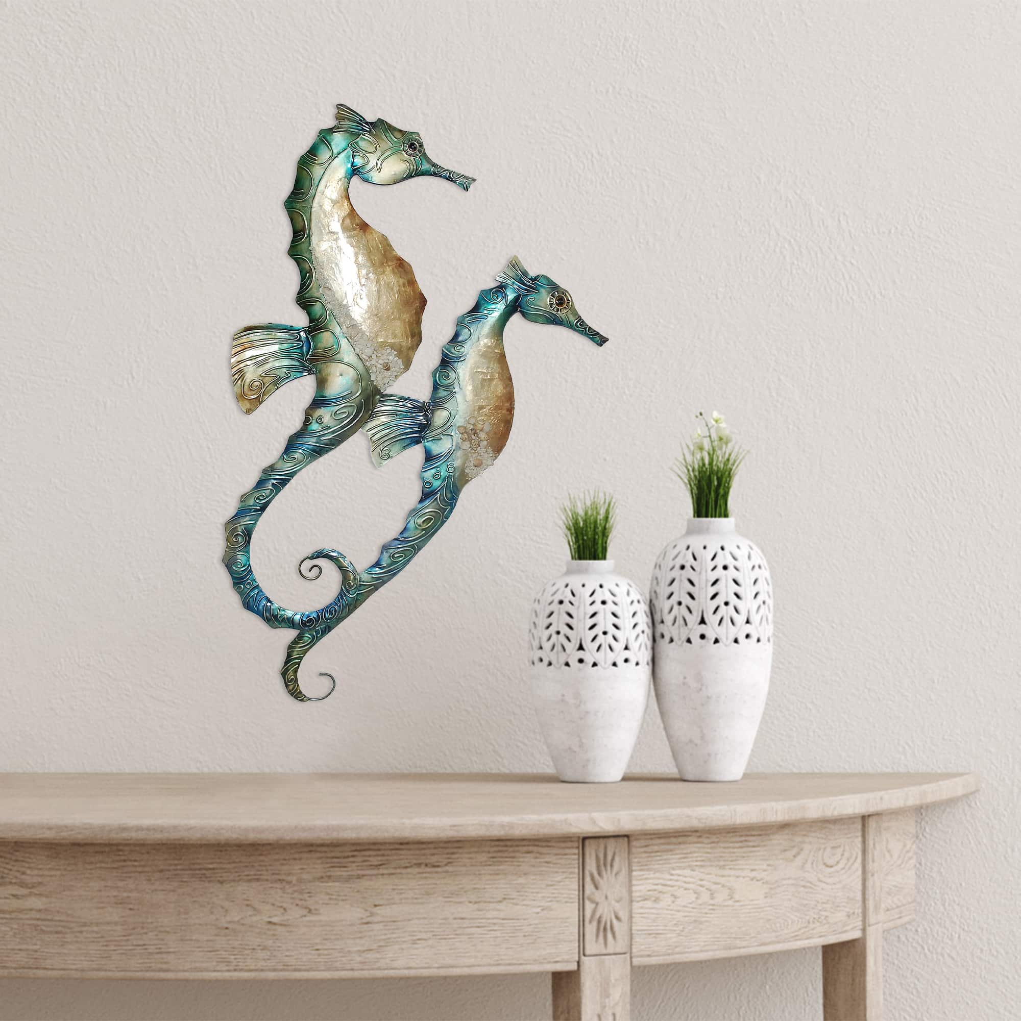 The basic frame of the wall seahorses is created using tin, which is powder coated as a black finish. Capiz is an oyster shell and the primary purpose of the oyster is as a source of food. However, the by-product, the shell, can be used for decoration. Due to it being a natural material, the natural colors of the capiz can come through as tans and browns.