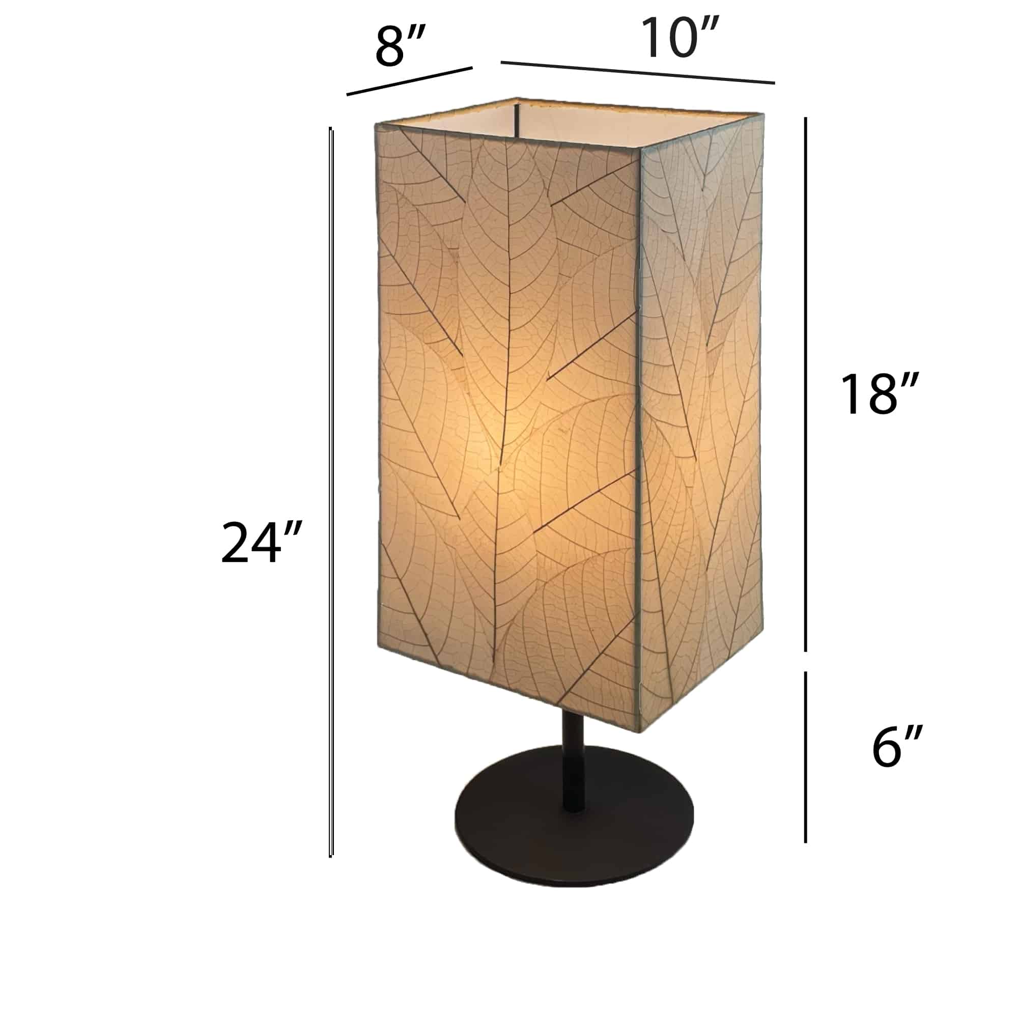 The rectangular shape gives it a clean, modern profile, while the sturdy iron base—reminiscent of a sequoia trunk—adds weight and balance. Whether in natural tones or bright jewel hues, the lamp feels both rooted and radiant. Every part of its construction—from the fair-trade leaf harvesting to the non-toxic dyes and adhesives—reflects a commitment to sustainable, ethical craft.