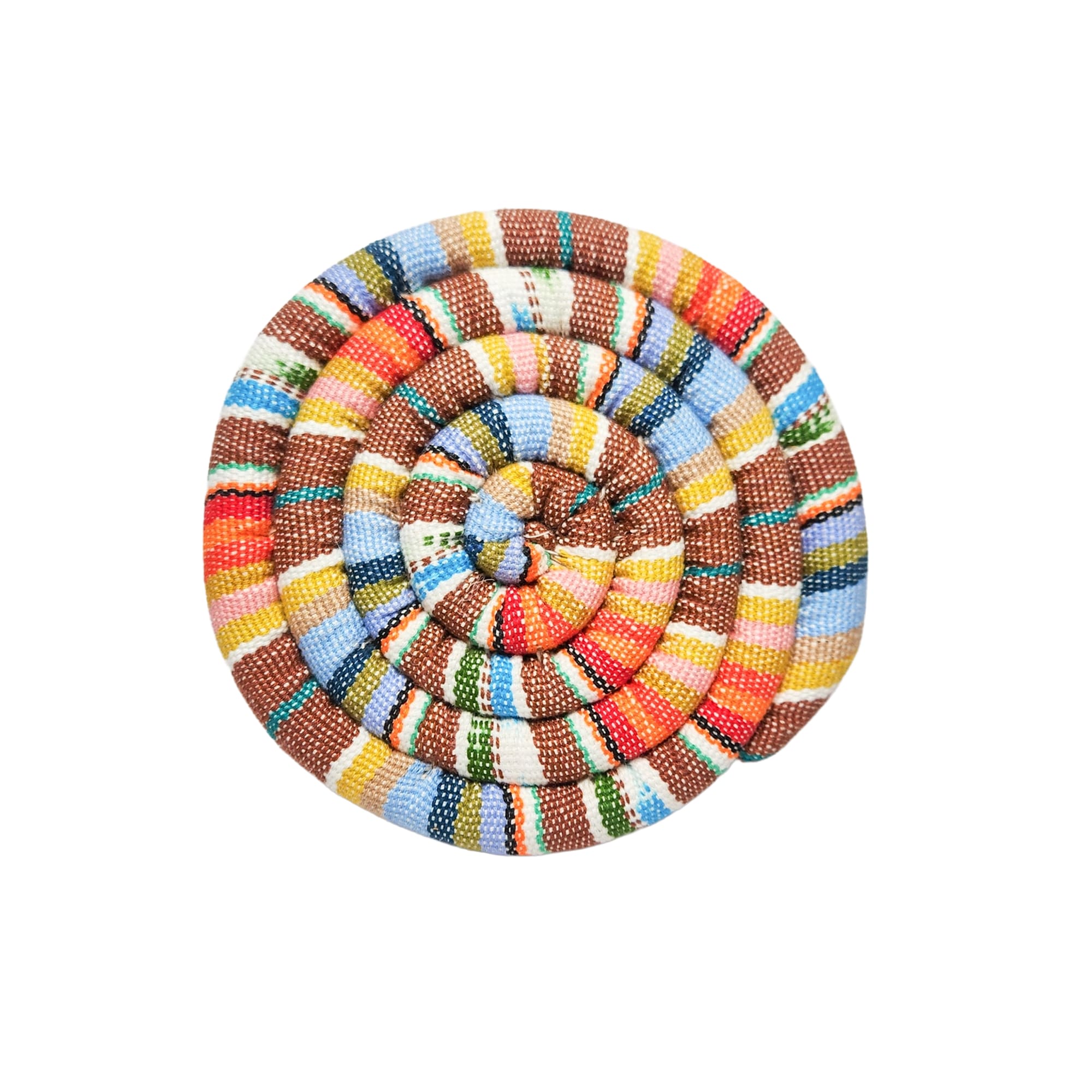 Our Medium Spiral Trivets are an absolute best seller! Covered in handmade Guatemalan fabric, this microwaveable miracle releases the scent of cinnamon, cloves, and coffee when warmed. Handmade and Fair Trade, this beauty keeps your food or kettle heated and warm!