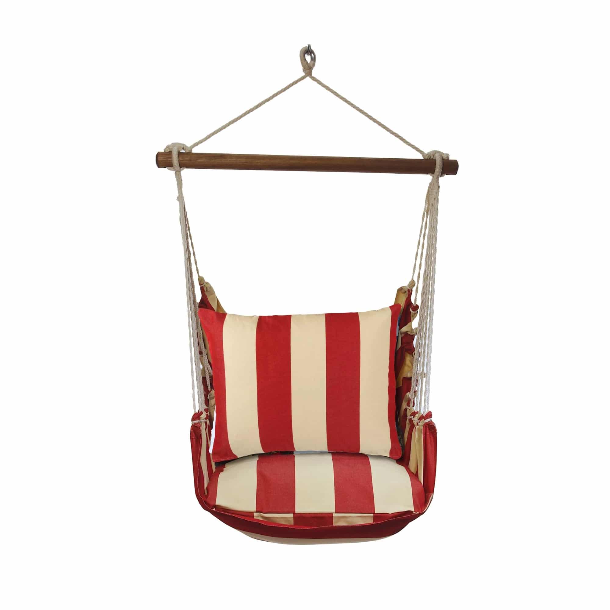 Imagine a lazy porch afternoon where bold red and cream stripes frame every laugh, every glass of lemonade and the soft creak of a wood bar hand-finished by craftswomen whose skills have been handed down like family recipes. The seat rocks on sturdy cotton-feel Sundure that shrugs off sun and sudden showers, letting you focus on gathering friends and making new memories. Includes a swing with wood bar, a 24×24‑inch stuffed seat pillow, a 19×24‑inch back pillow and a tote bag for indoor / outdoor use, all in Sundure fabric (100% polyester) that feels like cotton.