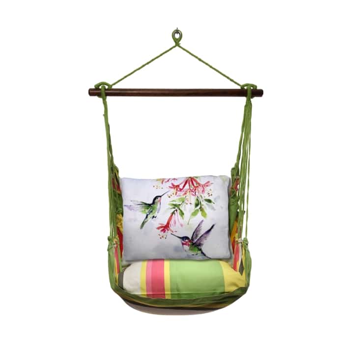 Picture a slow porch afternoon where fresh lime stripe frames every laugh and lazy sip of iced tea. A 2 Hummers w/Hanging Plant cushion adds its own personality, turning the swing into functional art. Hand-sewn from Sundure fabric that feels like cotton yet resists fade, mildew, and sudden showers, each set is built for real life outside so you can linger without fussing over the weather. A smoothly finished hardwood bar keeps the seat open and balanced, while durable hanging ropes clip up in moments and fold flat for off-season storage. The four-piece kit arrives ready to relax: swing seat, overstuffed 24×24-inch seat pillow, 19×24-inch back pillow, and a matching tote for easy travel or winter stow-away. Machine-washable and mood-lifting, it’s the quickest way to add a touch of crafted comfort wherever you hang it.