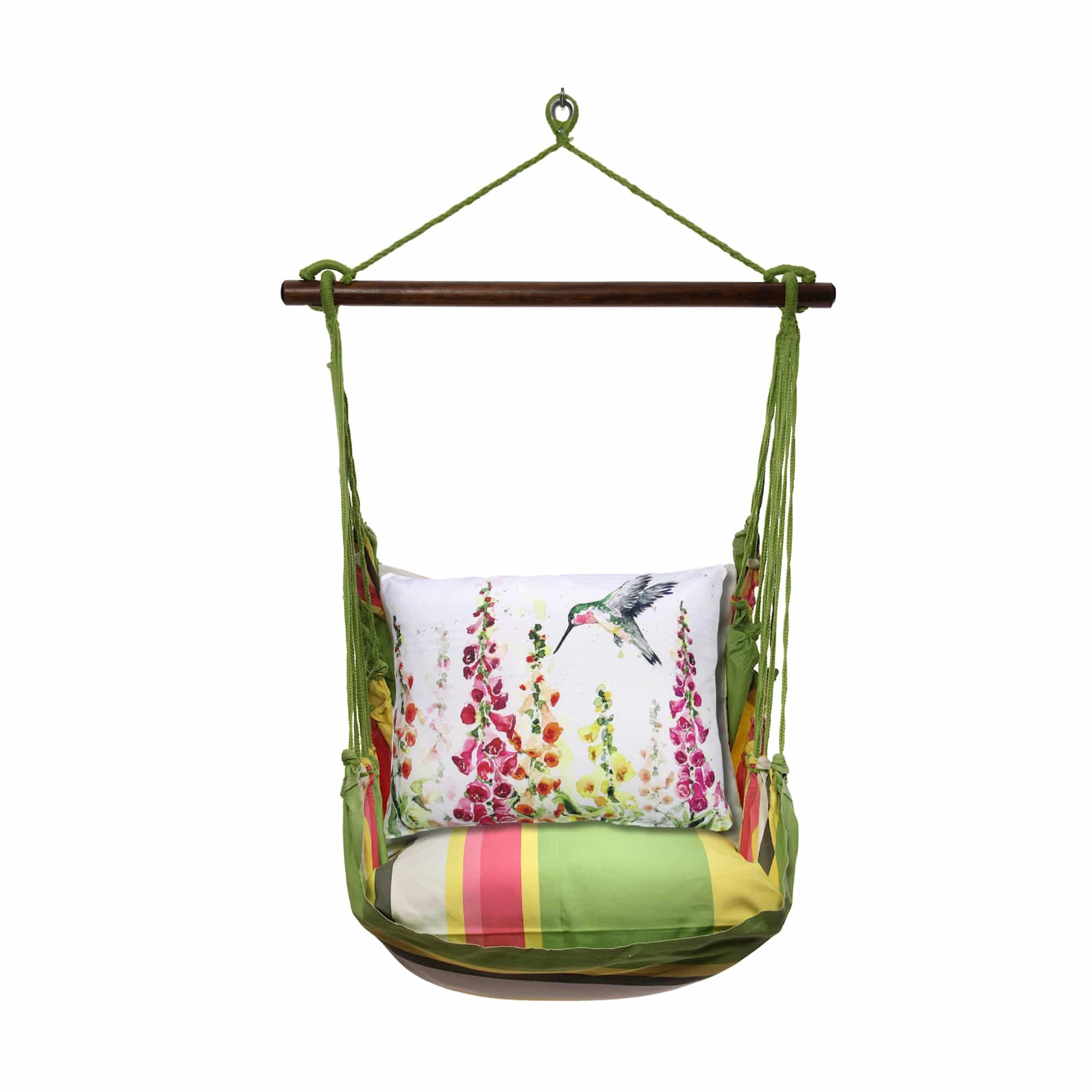 Envision a breezy corner of your yard where fresh lime stripe invites daydreams and gentle conversation. A Foxgloves w/ Hummingbird cushion adds its own personality, turning the swing into functional art. Hand-sewn from Sundure fabric that feels like cotton yet resists fade, mildew, and sudden showers, each set is built for real life outside so you can linger without fussing over the weather. A smoothly finished hardwood bar keeps the seat open and balanced, while durable hanging ropes clip up in moments and fold flat for off-season storage. The four-piece kit arrives ready to relax: swing seat, overstuffed 24×24-inch seat pillow, 19×24-inch back pillow, and a matching tote for easy travel or winter stow-away. Machine-washable and mood-lifting, it’s the quickest way to add a touch of crafted comfort wherever you hang it.