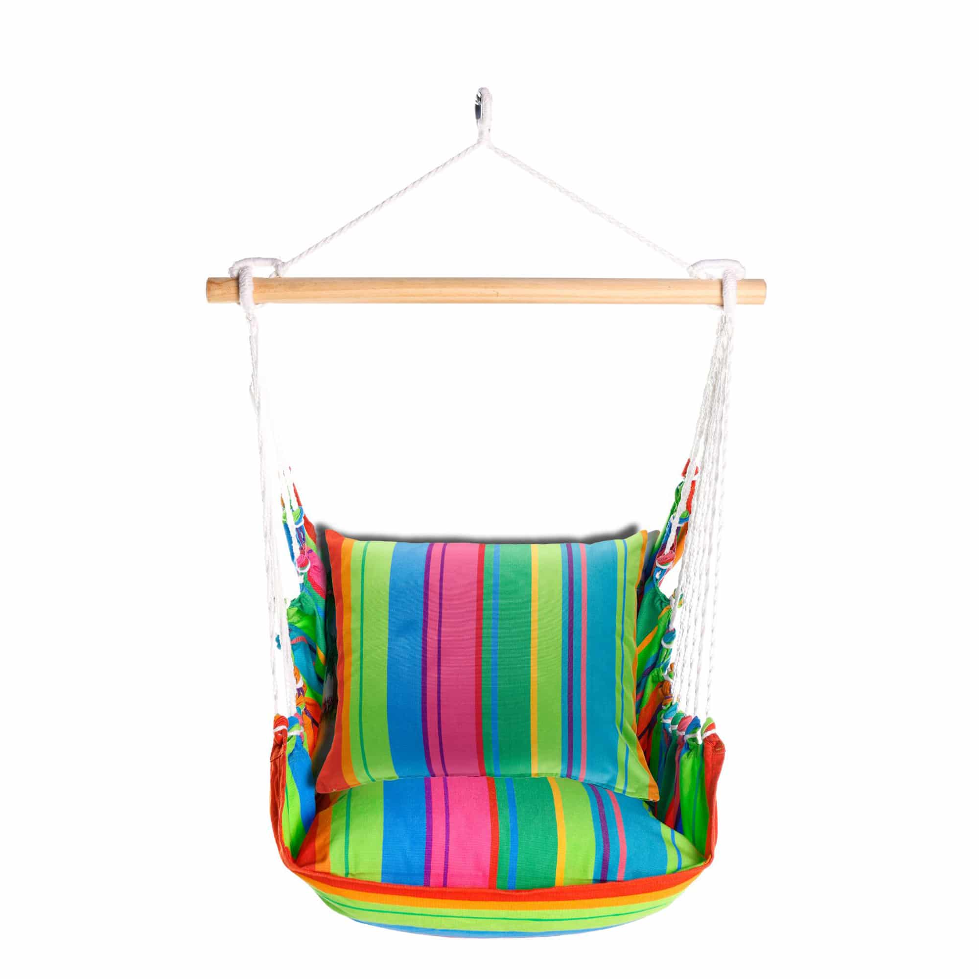 | Additional Parts | 4-piece Serene Sunset Swing Set: swing with wood bar, one 24×24 in. stuffed seat pillow, one 19×24 in. back pillow and one tote bag for indoor / outdoor use. Pillow inserts are included. Insert is 100% polyester. Zipper closure on pillow for easy removal. Swing can be mounted to a tree or a sturdy beam in a ceiling or porch. Hanging hardware sold separately. |