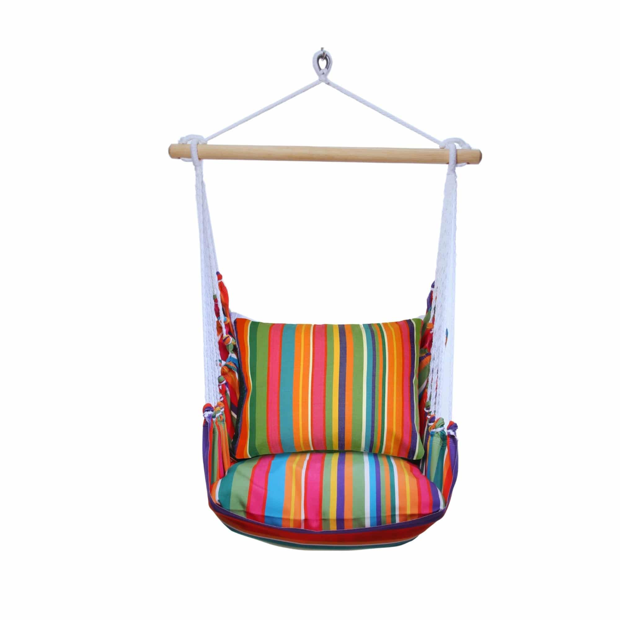 | Additional Parts | 4-piece Serene Sunset Swing Set: swing with wood bar, one 24×24 in. stuffed seat pillow, one 19×24 in. back pillow and one tote bag for indoor / outdoor use. Pillow inserts are included. Insert is 100% polyester. Zipper closure on pillow for easy removal. Swing can be mounted to a tree or a sturdy beam in a ceiling or porch. Hanging hardware sold separately. |