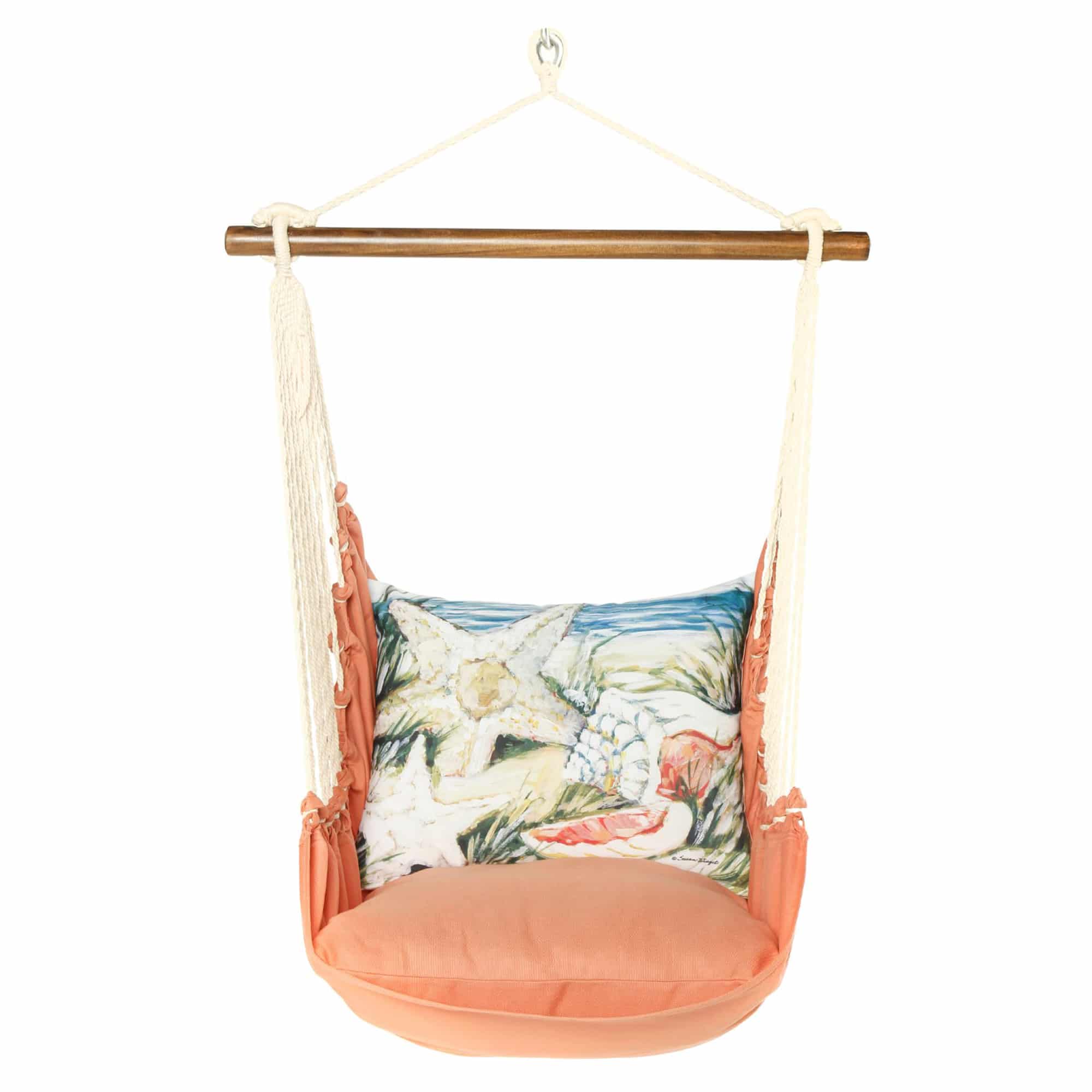 Think of weekend mornings when living coral turns the porch into a private retreat. A Seashells cushion adds its own personality, turning the swing into functional art. Hand-sewn from Sundure fabric that feels like cotton yet resists fade, mildew, and sudden showers, each set is built for real life outside so you can linger without fussing over the weather. A smoothly finished hardwood bar keeps the seat open and balanced, while durable hanging ropes clip up in moments and fold flat for off-season storage. The four-piece kit arrives ready to relax: swing seat, overstuffed 24×24-inch seat pillow, 19×24-inch back pillow, and a matching tote for easy travel or winter stow-away. Machine-washable and mood-lifting, it’s the quickest way to add a touch of crafted comfort wherever you hang it.