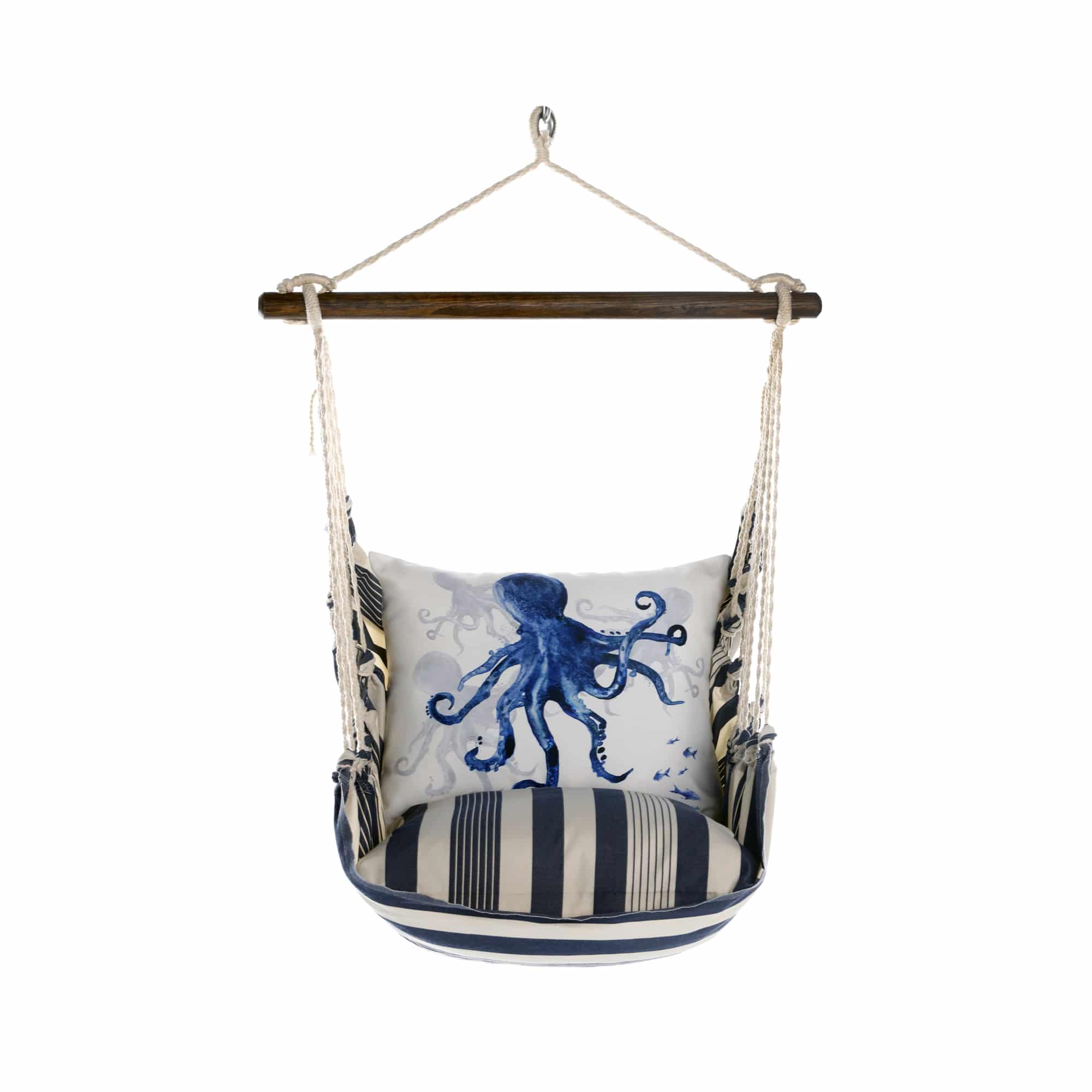 Think of weekend mornings when marina stripe turns the porch into a private retreat. A Indigo Octopus cushion adds its own personality, turning the swing into functional art. Hand-sewn from Sundure fabric that feels like cotton yet resists fade, mildew, and sudden showers, each set is built for real life outside so you can linger without fussing over the weather. A smoothly finished hardwood bar keeps the seat open and balanced, while durable hanging ropes clip up in moments and fold flat for off-season storage. The four-piece kit arrives ready to relax: swing seat, overstuffed 24×24-inch seat pillow, 19×24-inch back pillow, and a matching tote for easy travel or winter stow-away. Machine-washable and mood-lifting, it’s the quickest way to add a touch of crafted comfort wherever you hang it.
