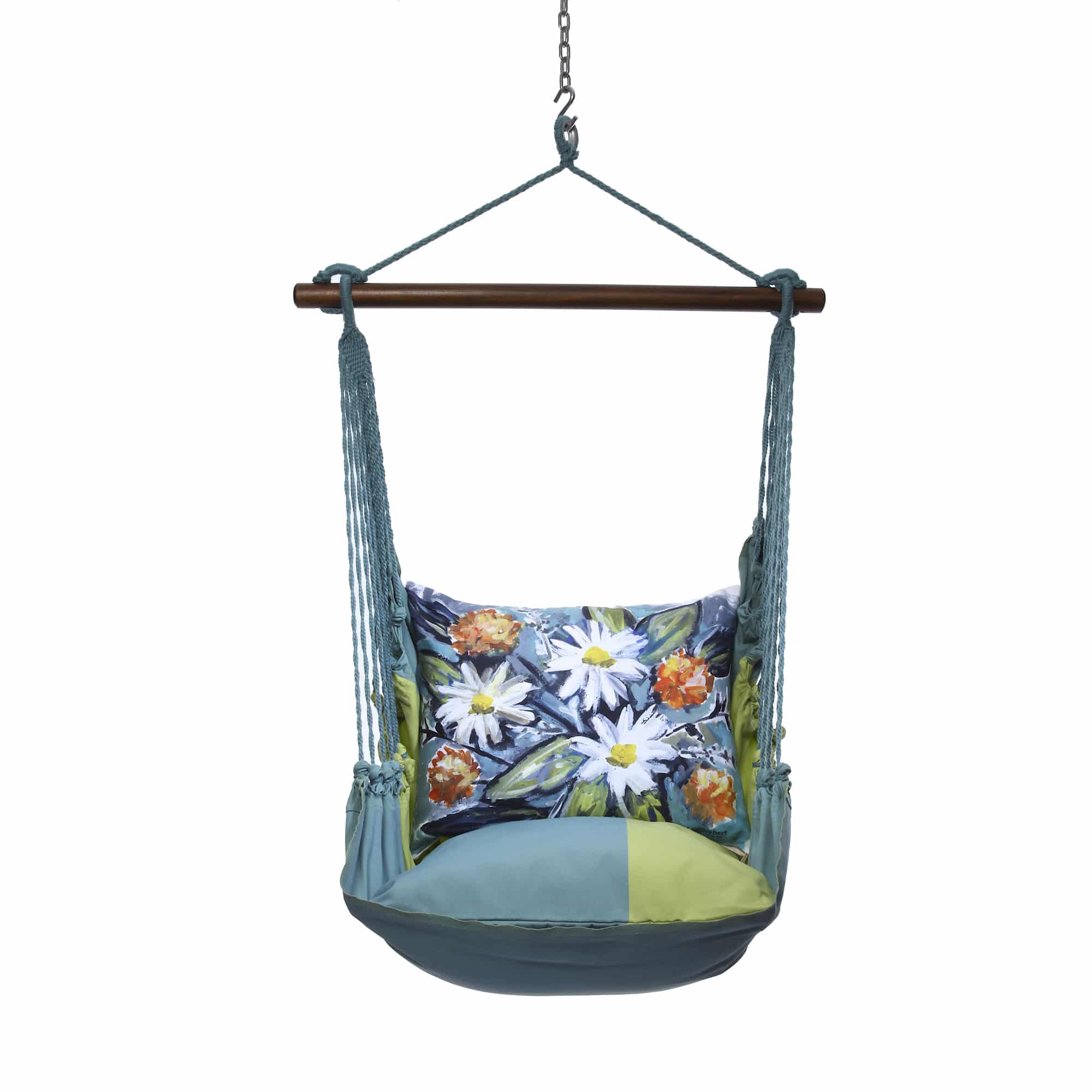 | Additional Parts | 4-piece Serene Sunset Swing Set: swing with wood bar, one 24×24 in. stuffed seat pillow, one 19×24 in. back pillow and one tote bag for indoor / outdoor use. Pillow inserts are included. Insert is 100% polyester. Zipper closure on pillow for easy removal. Swing can be mounted to a tree or a sturdy beam in a ceiling or porch. Hanging hardware sold separately. |