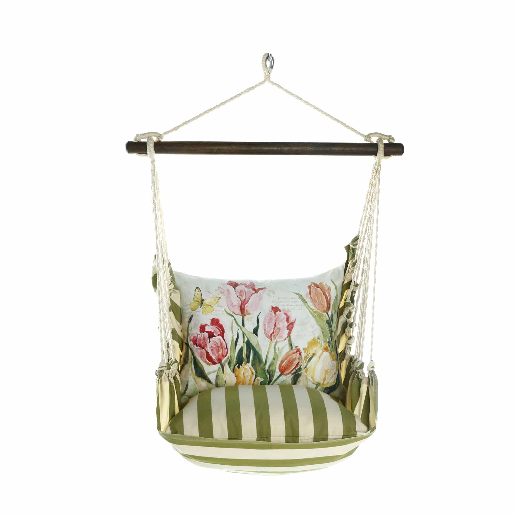 Envision a breezy corner of your yard where summer palms stripe invites daydreams and gentle conversation. A Pink and Yellow Tulips cushion adds its own personality, turning the swing into functional art. Hand-sewn from Sundure fabric that feels like cotton yet resists fade, mildew, and sudden showers, each set is built for real life outside so you can linger without fussing over the weather. A smoothly finished hardwood bar keeps the seat open and balanced, while durable hanging ropes clip up in moments and fold flat for off-season storage. The four-piece kit arrives ready to relax: swing seat, overstuffed 24×24-inch seat pillow, 19×24-inch back pillow, and a matching tote for easy travel or winter stow-away. Machine-washable and mood-lifting, it’s the quickest way to add a touch of crafted comfort wherever you hang it.