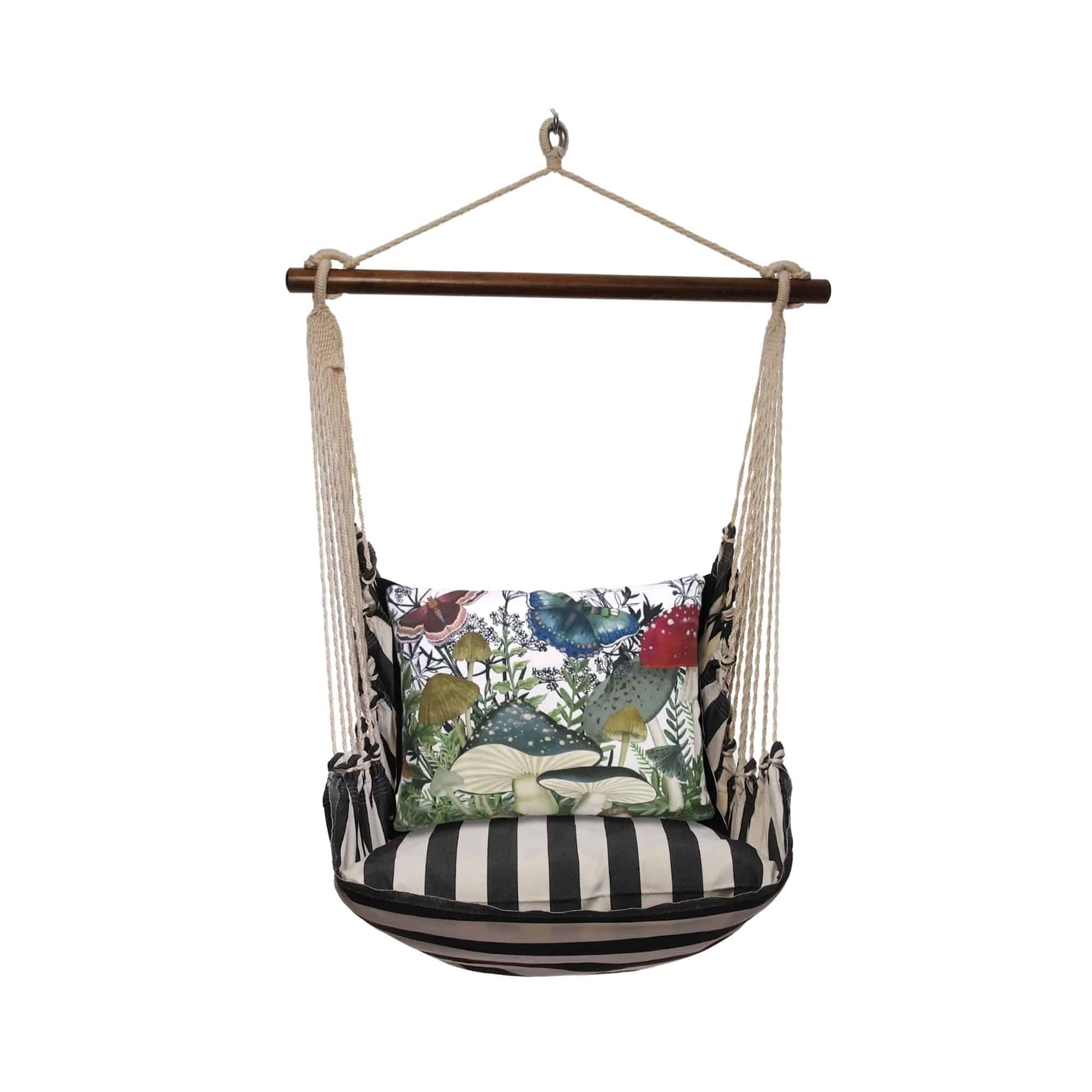 Think of weekend mornings when true black stripe turns the porch into a private retreat. A Botanical Mushrooms 2 cushion adds its own personality, turning the swing into functional art. Hand-sewn from Sundure fabric that feels like cotton yet resists fade, mildew, and sudden showers, each set is built for real life outside so you can linger without fussing over the weather. A smoothly finished hardwood bar keeps the seat open and balanced, while durable hanging ropes clip up in moments and fold flat for off-season storage. The four-piece kit arrives ready to relax: swing seat, overstuffed 24×24-inch seat pillow, 19×24-inch back pillow, and a matching tote for easy travel or winter stow-away. Machine-washable and mood-lifting, it’s the quickest way to add a touch of crafted comfort wherever you hang it.