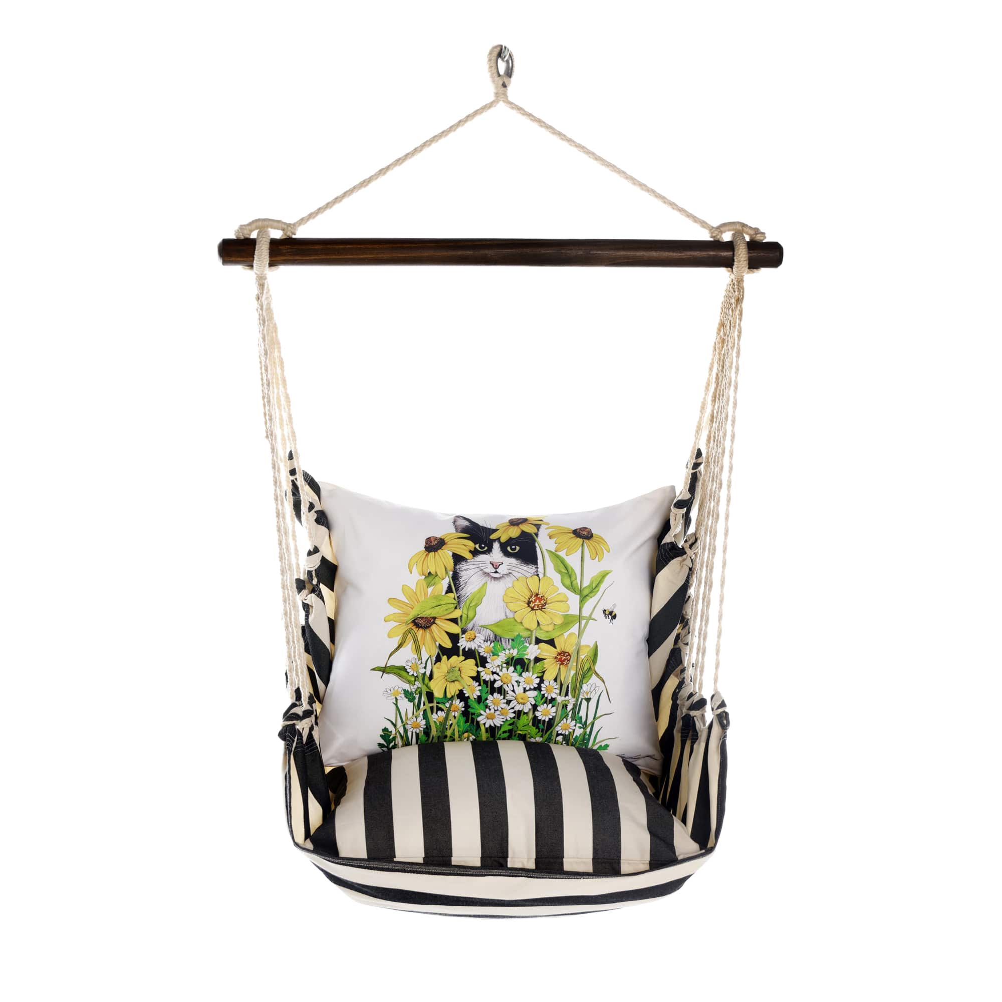 Picture a slow porch afternoon where true black stripe frames every laugh and lazy sip of iced tea. A Cat with Daisies cushion adds its own personality, turning the swing into functional art. Hand-sewn from Sundure fabric that feels like cotton yet resists fade, mildew, and sudden showers, each set is built for real life outside so you can linger without fussing over the weather. A smoothly finished hardwood bar keeps the seat open and balanced, while durable hanging ropes clip up in moments and fold flat for off-season storage. The four-piece kit arrives ready to relax: swing seat, overstuffed 24×24-inch seat pillow, 19×24-inch back pillow, and a matching tote for easy travel or winter stow-away. Machine-washable and mood-lifting, it’s the quickest way to add a touch of crafted comfort wherever you hang it.