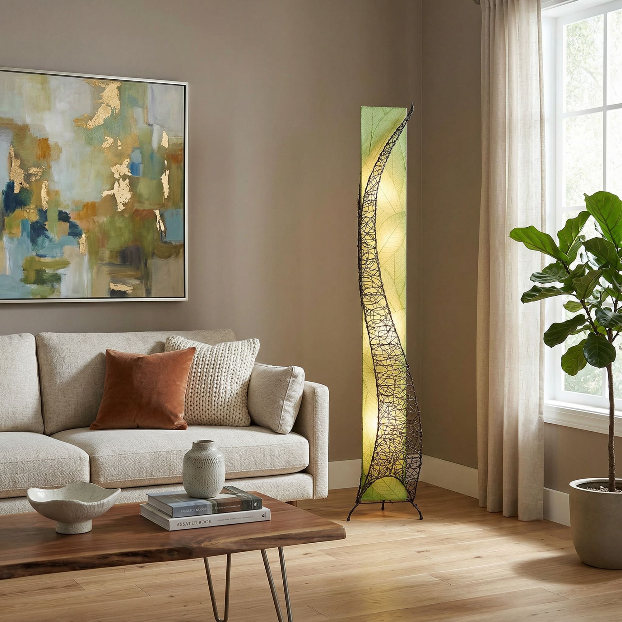 Even when unlit, it reads as a statement piece. When illuminated, the leaf texture glows with warmth and depth, creating an atmosphere that feels grounded, calm, and quietly confident. This is not a lamp you buy to fill a corner. It is one you choose because it speaks to your taste and elevates the room around it.
