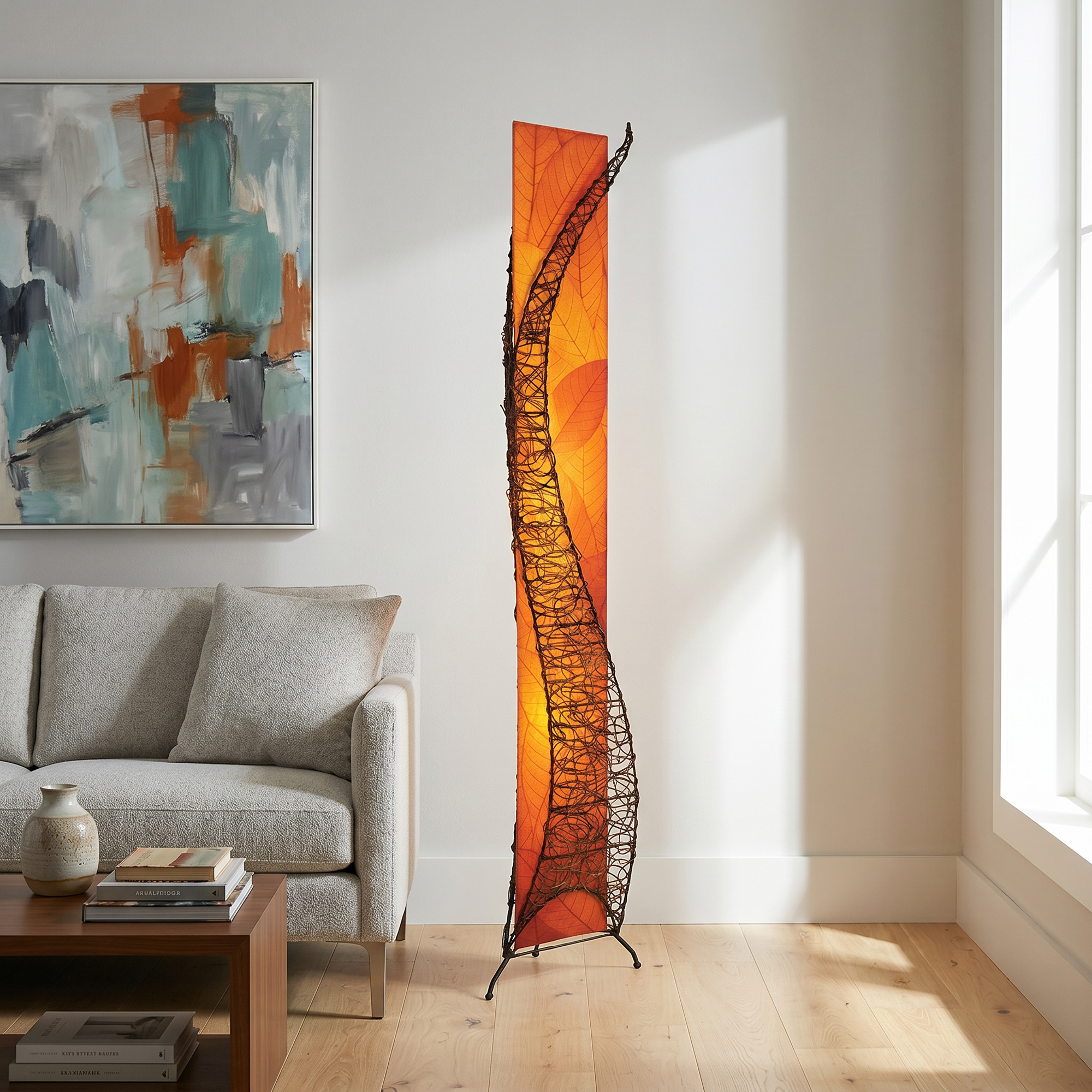The Wings Giant Floor Lamp is designed to make an immediate impression. It shifts the mood of a room the moment it’s placed, bringing movement, light, and intention into the space. The sculptural frame is wrapped in a flowing lattice of nito vine, layered over real fossilized cocoa leaves that catch and soften the light in a way that feels alive rather than decorative.