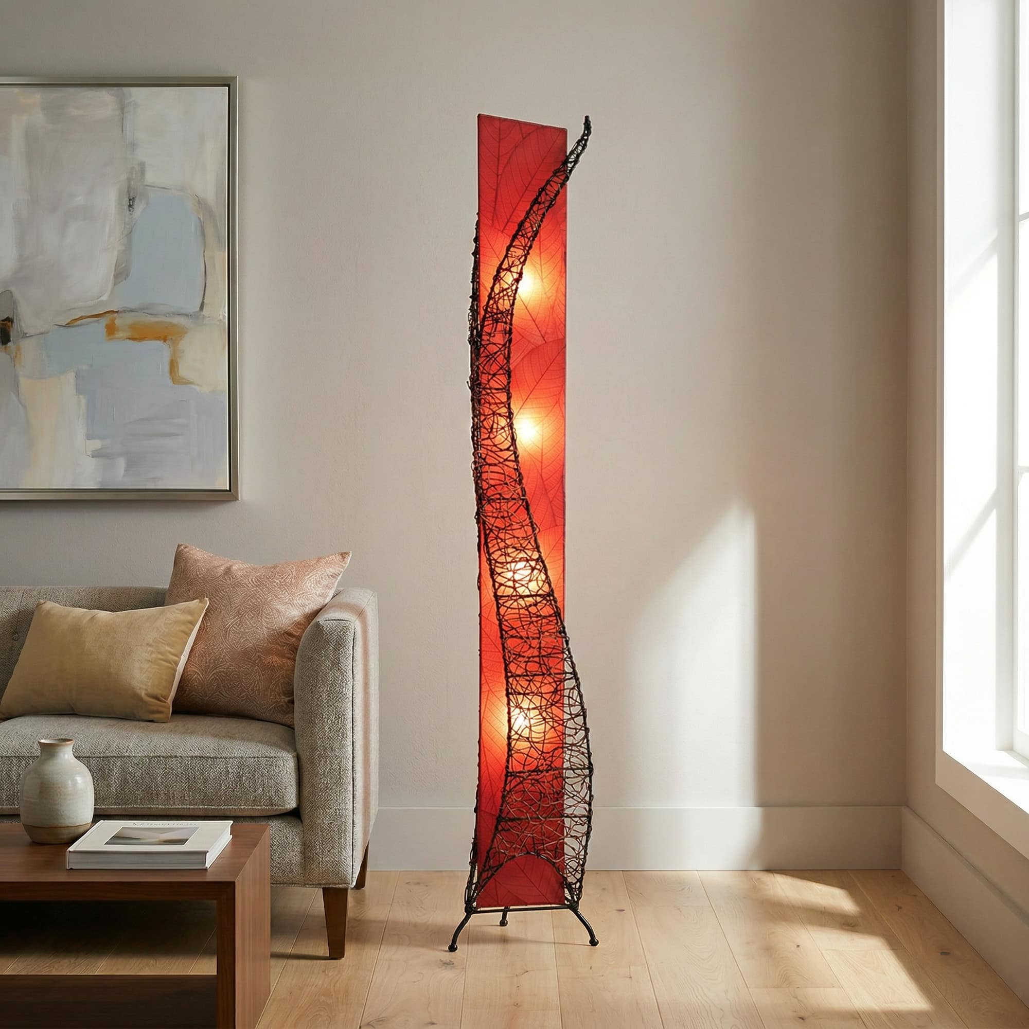 The Wings Giant Floor Lamp is designed to make an immediate impression. It shifts the mood of a room the moment it’s placed, bringing movement, light, and intention into the space. The sculptural frame is wrapped in a flowing lattice of nito vine, layered over real fossilized cocoa leaves that catch and soften the light in a way that feels alive rather than decorative.